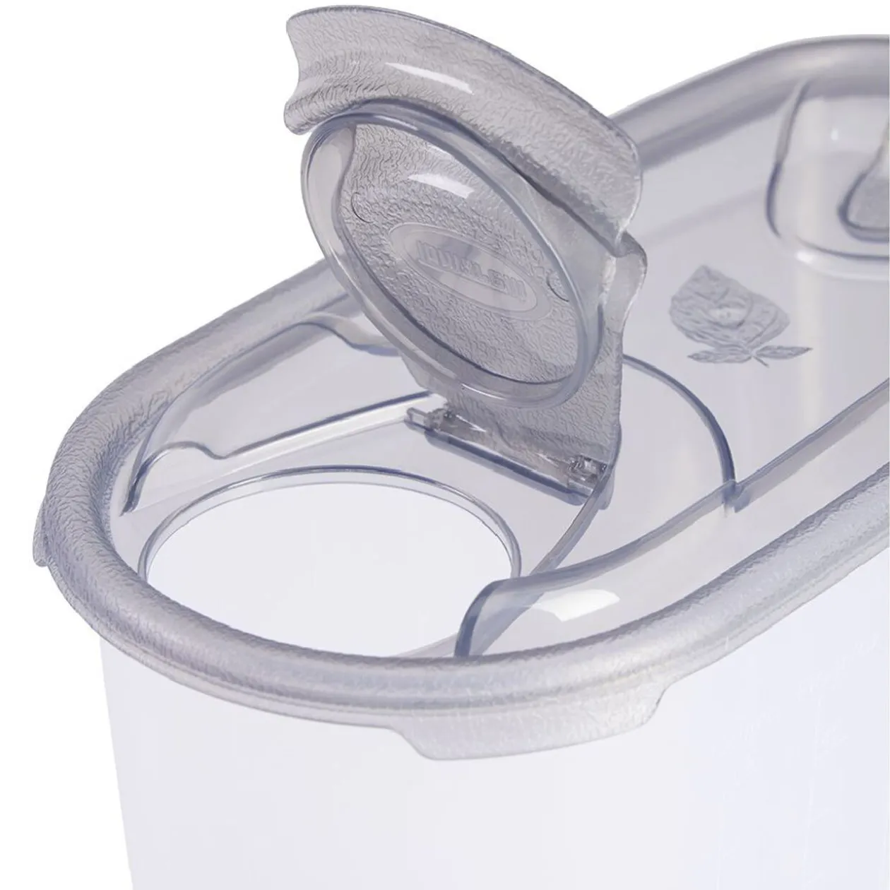 Boîte à céréales grise et blanche avec une contenance de 2 litres.