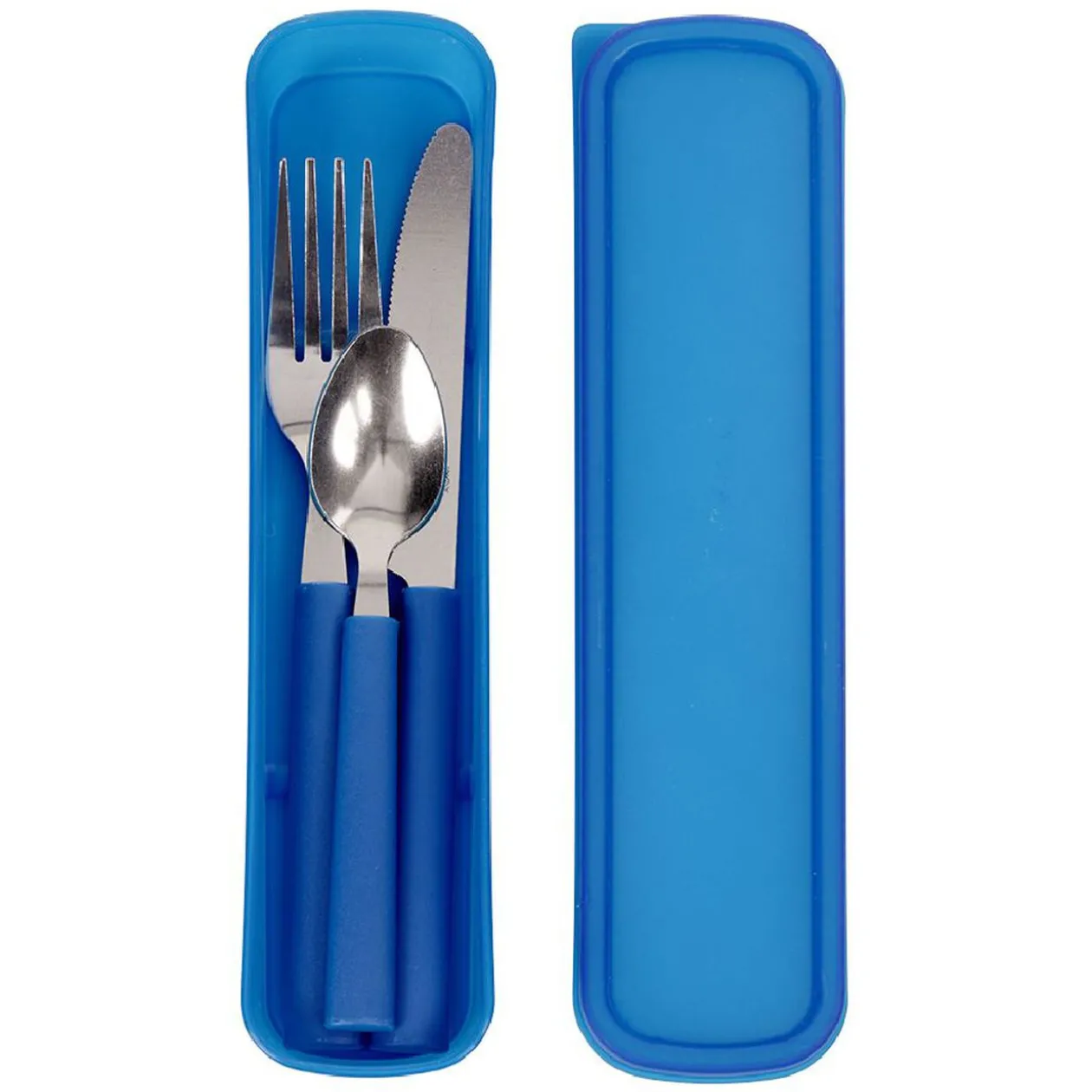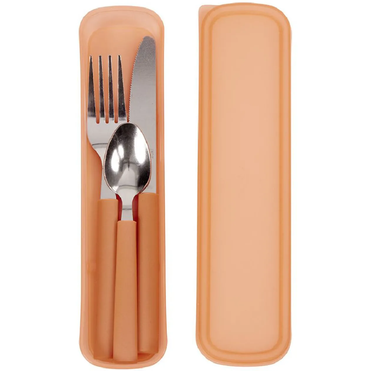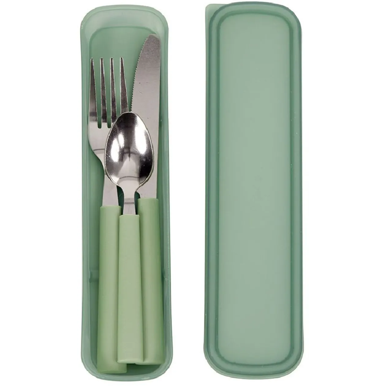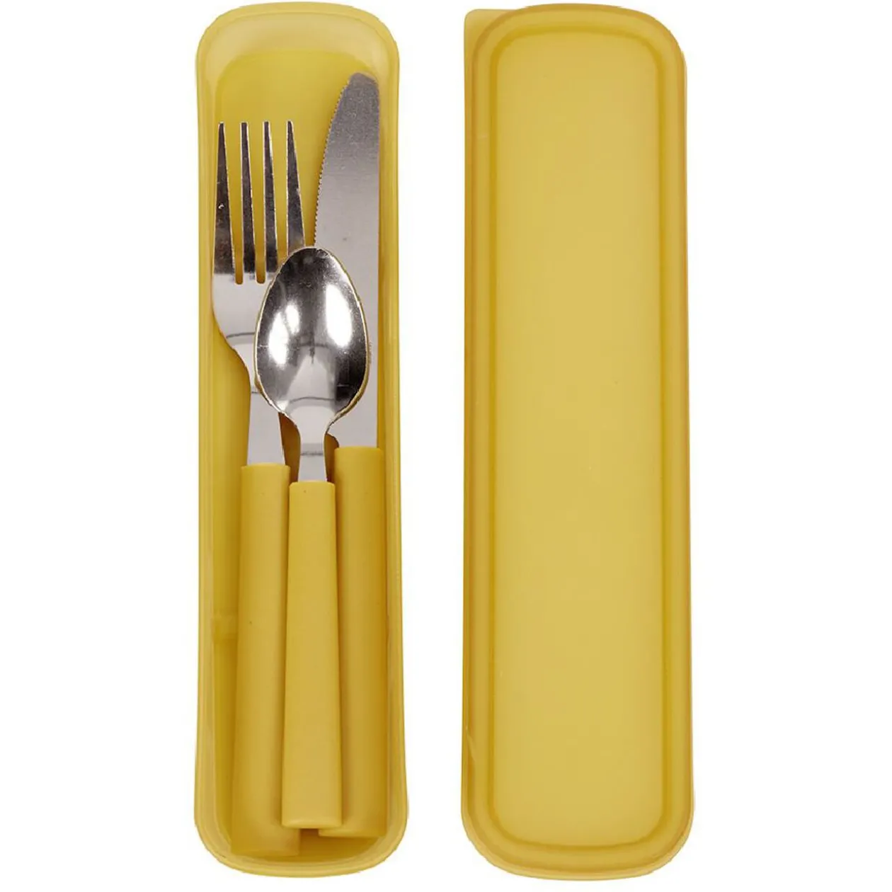 Boîte à couverts nomade munie d’un couteau, une fourchette et une petite cuillère.