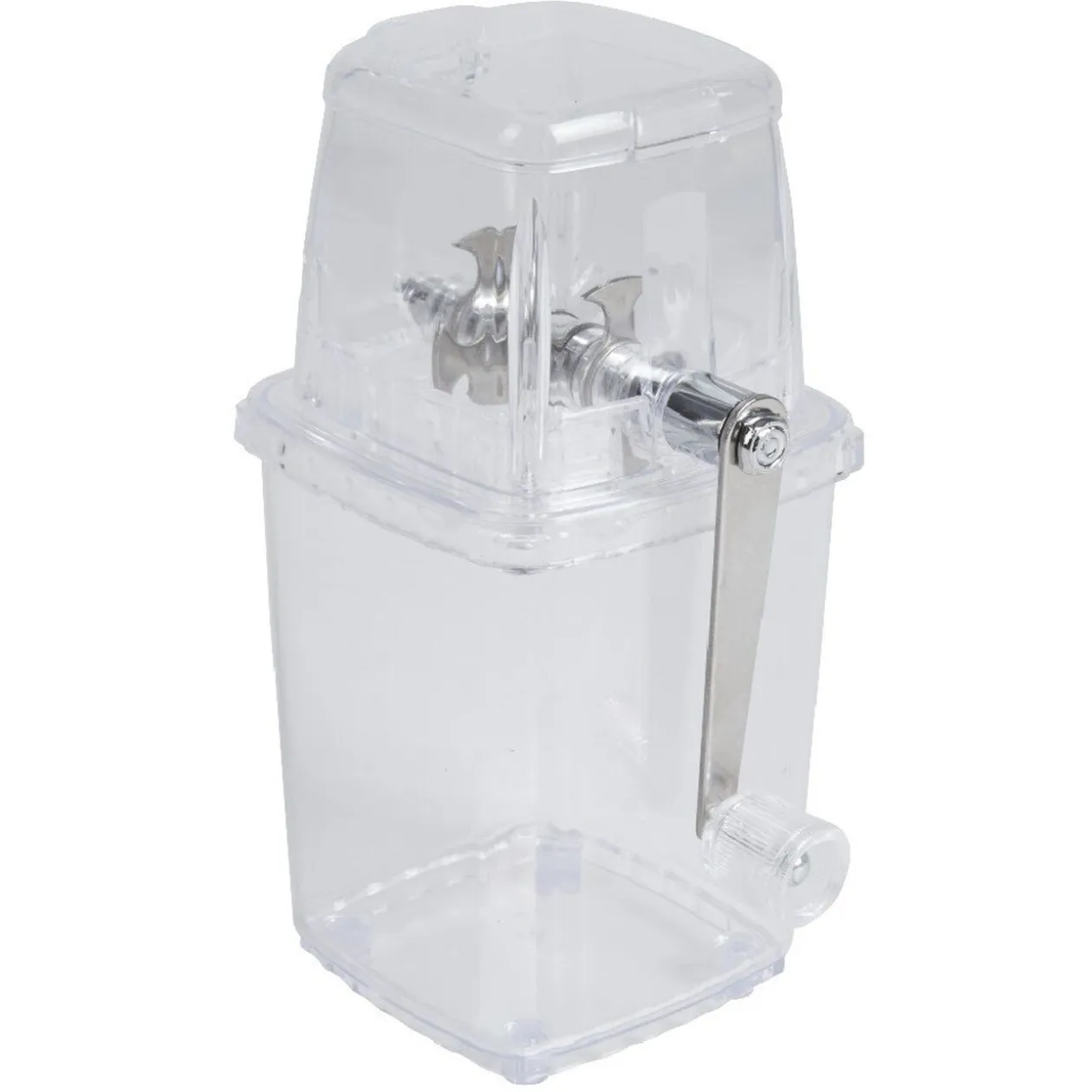 Ce broyeur à glace transparent avec manivelle et lame en métal vous permettra de préparer de la glace pilée en un tour de main!