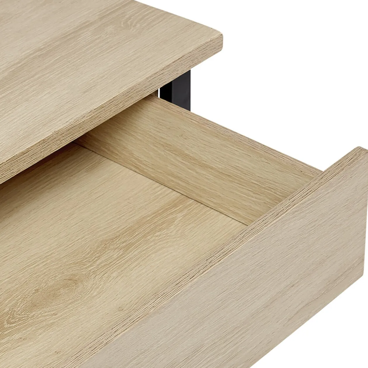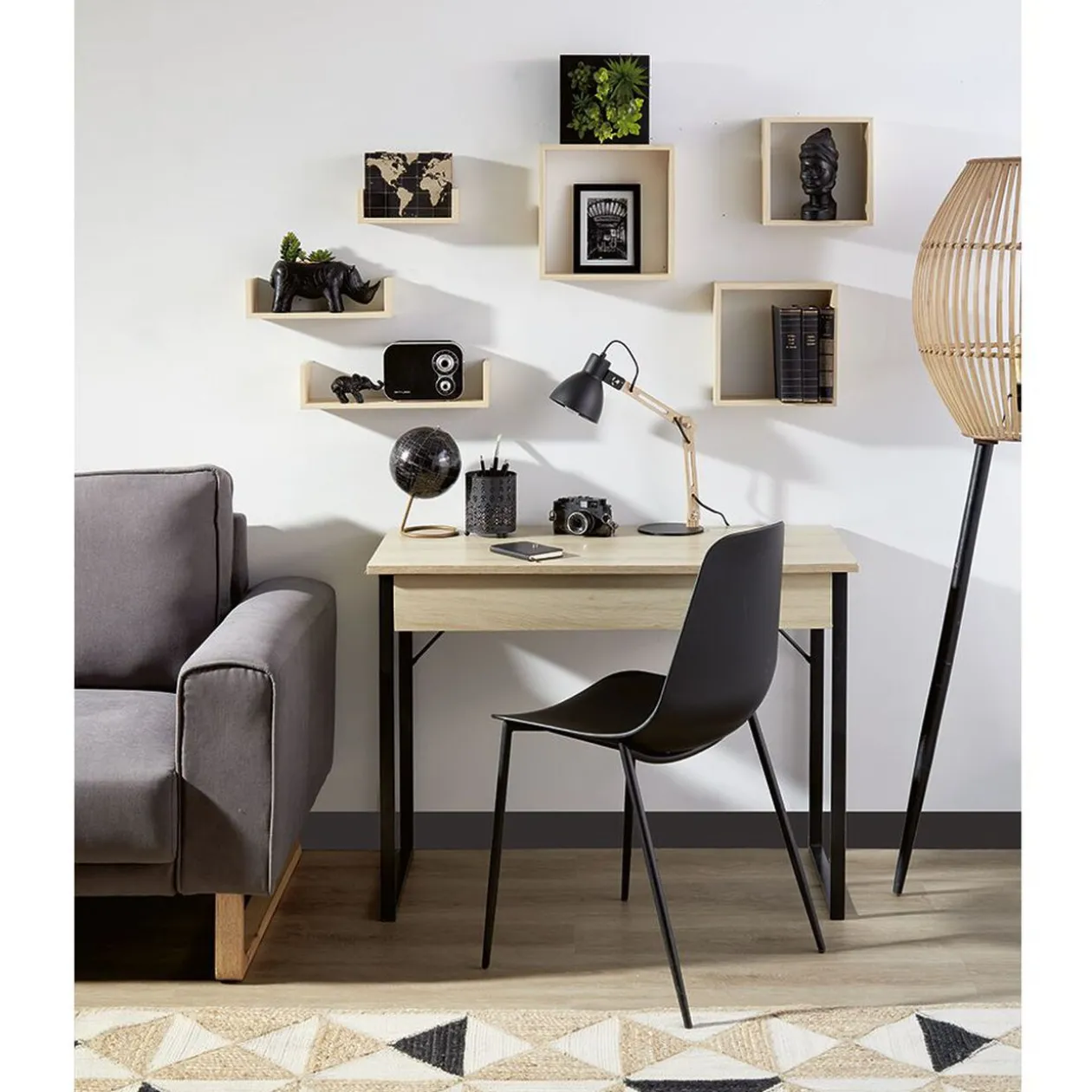 Il est composé d’une structure en métal noir et d’un plateau avec tiroir en panneau de particules recouvert d’un revêtement en papier déco à l’effet bois.