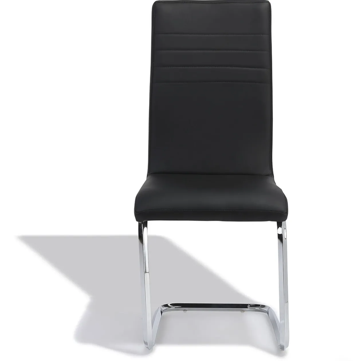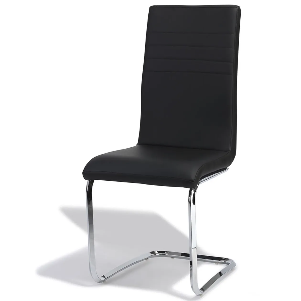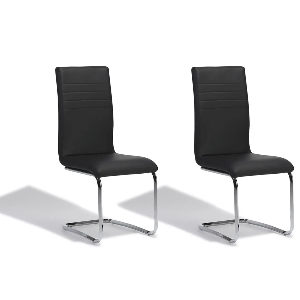 Afin d’obtenir des chaises qui vous conviennent, découvrez Doha ! Idéales pour les décorations modernes, installez ces chaises dans votre cuisine ou dans votre salon. Du métal compose la structure les rendant solides. Ces sièges disposent de pieds avant courbés jusqu’au dossier qui supportent toute la structure. Pour toujours plus de brillance, une finition chromée est appliquée. Le siège ainsi que le dossier sont réunis dans un seul et même revêtement, puis rembourrés avec de la mousse de polyuréthane, apportant une commodité optimale. D’un design original, le tout offre un lot de 2 chaises confortables qui donnera envie à vos enfants de rester à table. De couleur noire, elles s’adaptent à toute sorte de décoration, de la plus colorée à la plus sobre !