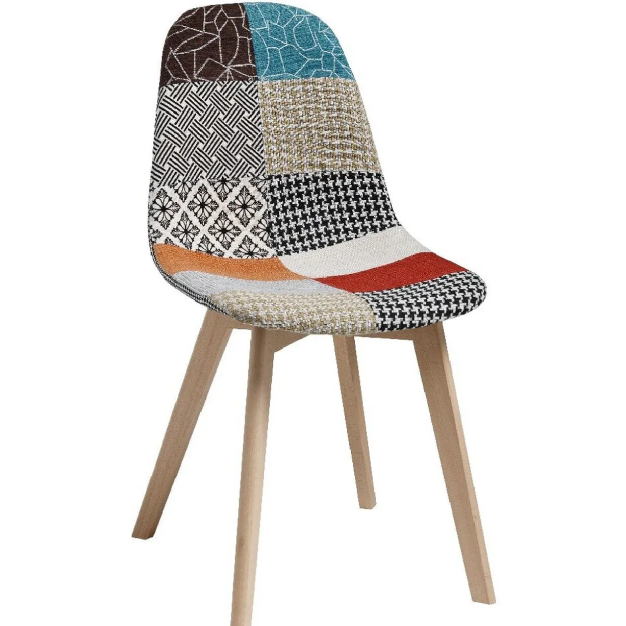 Lot de 2 chaises au style scandinave et patchwork au tissu 100% polyester multicolore. Une assise confortable en contreplaqué garnie en mousse de polyuréthane.