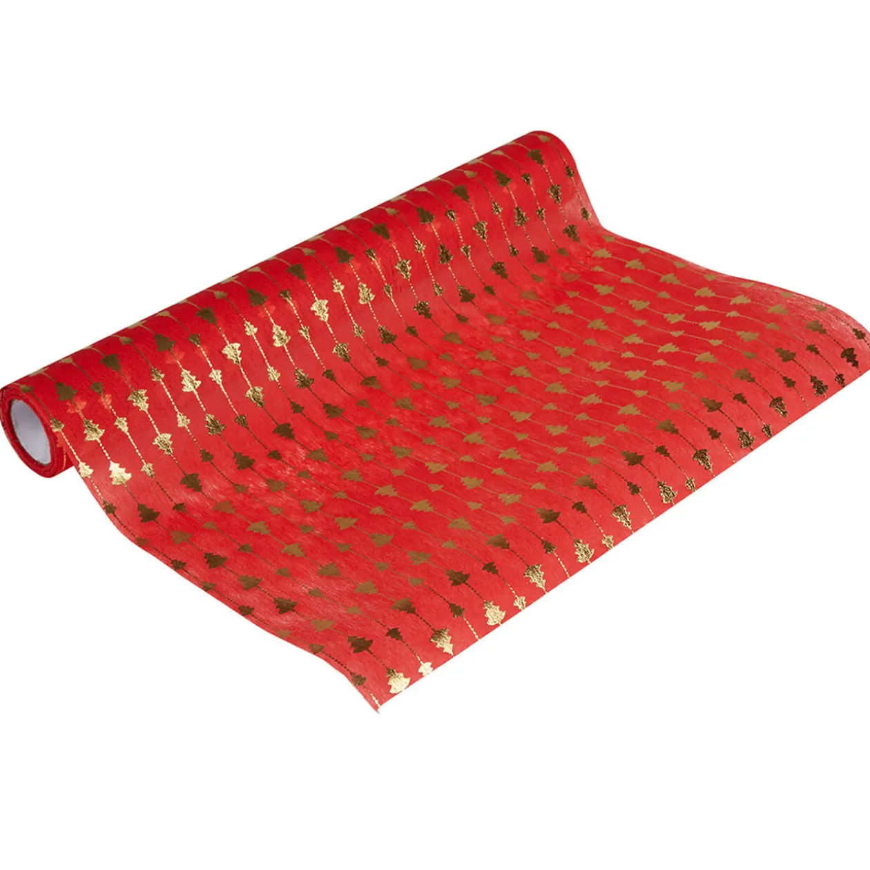 Apportez une touche de couleur et de brillance à votre table de fête avec ce chemin de table rouge décoré de guirlandes de sapins doré.