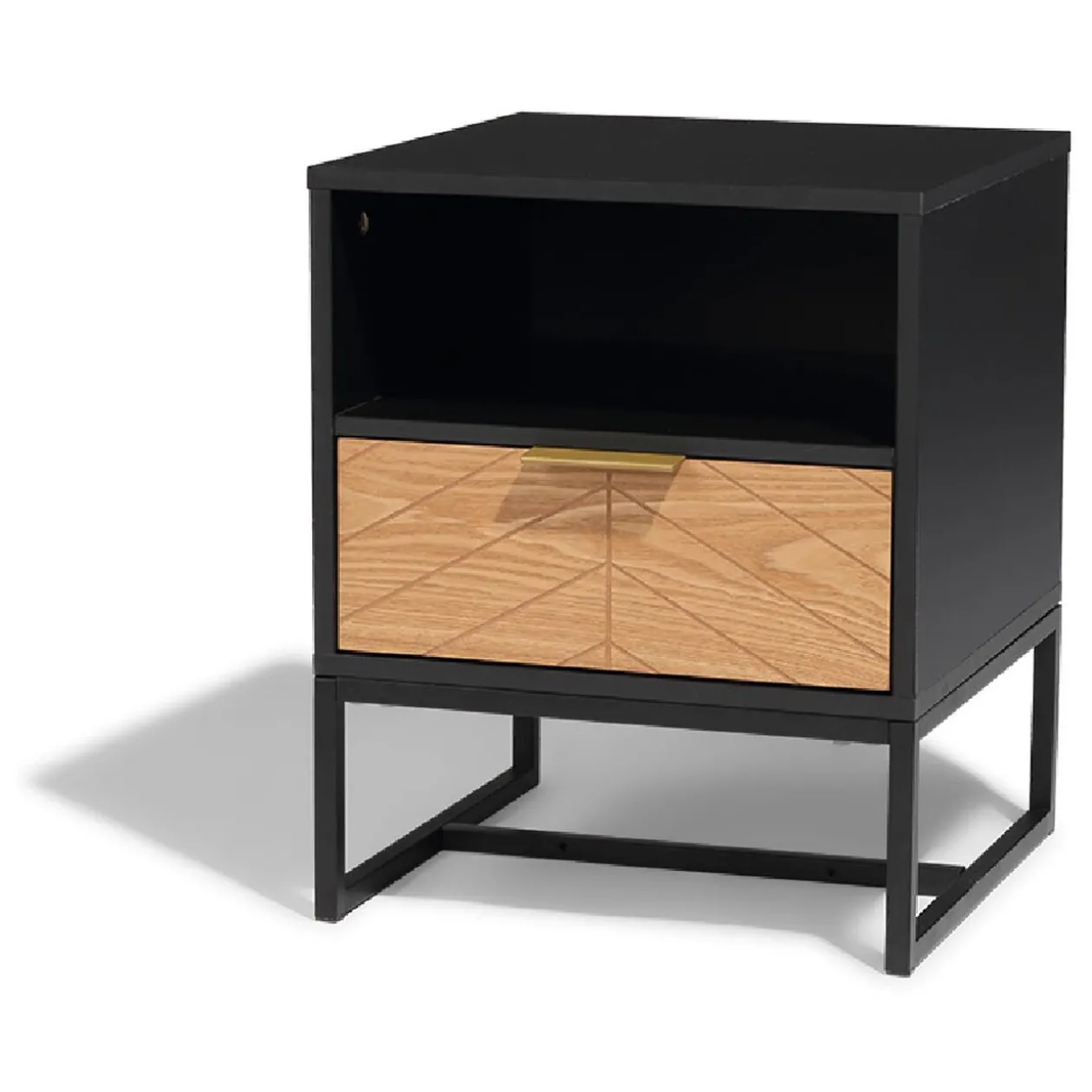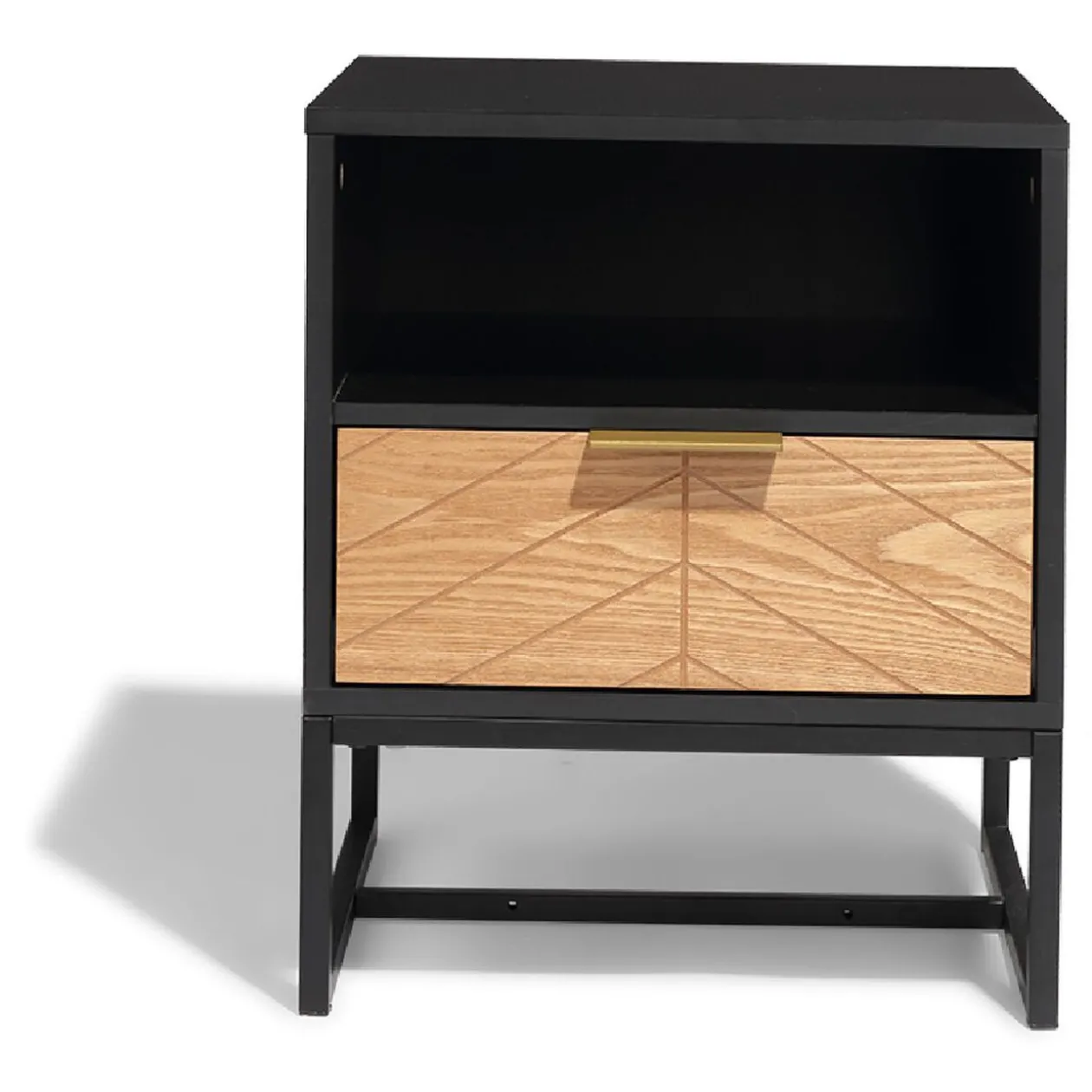 Pour une chambre au style impeccable, misez sur le chevet Eole ! De couleur noire, son piétement fin en métal et sa structure cubique contrastent avec son tiroir dont les tons tirent sur le miel. Situé sous une niche de rangement, ce tiroir présente des gravures soignées et est orné d’une poignée en métal doré. Grâce à cette table de chevet, vous resterez organisé en toute élégance.