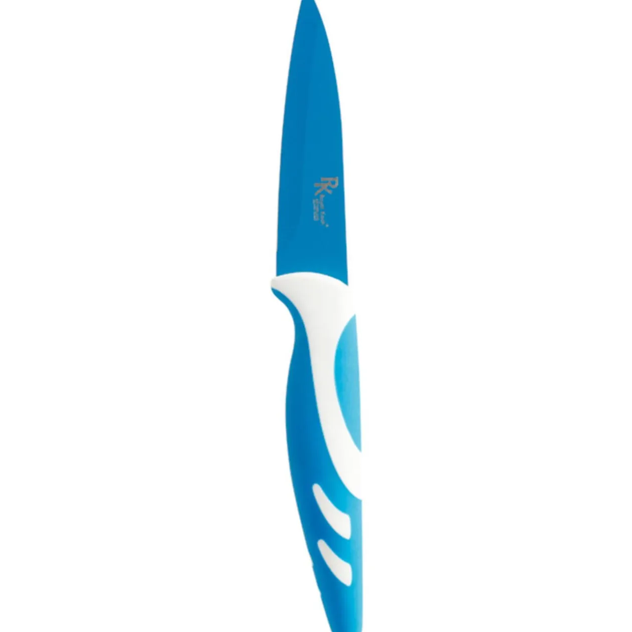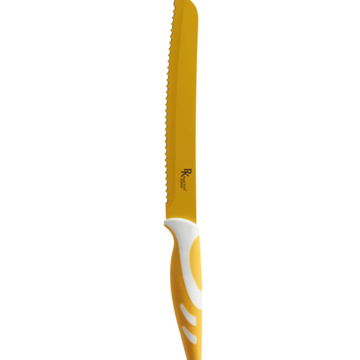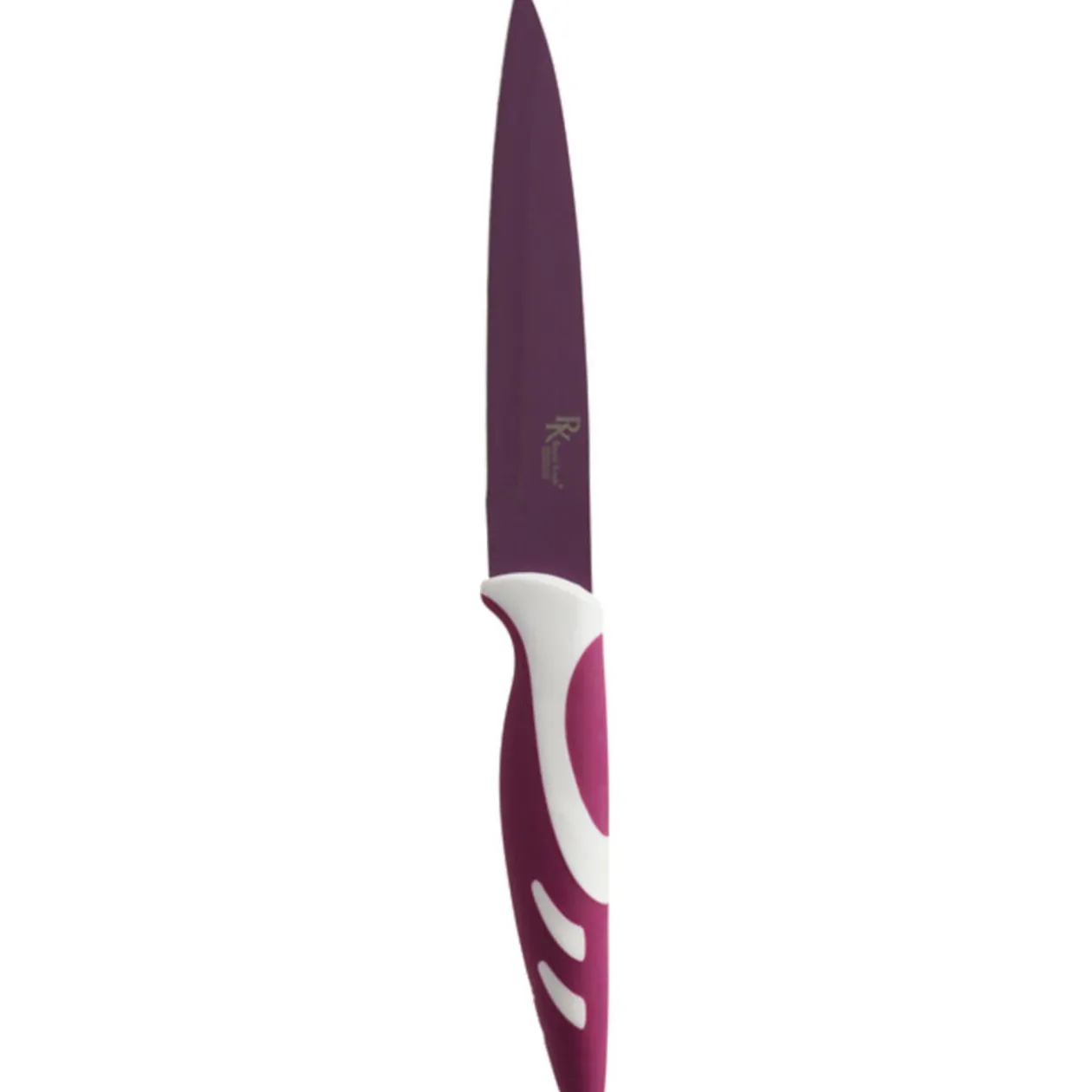 Coffret 6 couteaux multicolore (1 couteau-pain, 1 couteau chef, 1 couteau à émincer, 1 couteau universel, 1 couteau office, 1 couteau à pizza) et 1 éplucheur, métal.