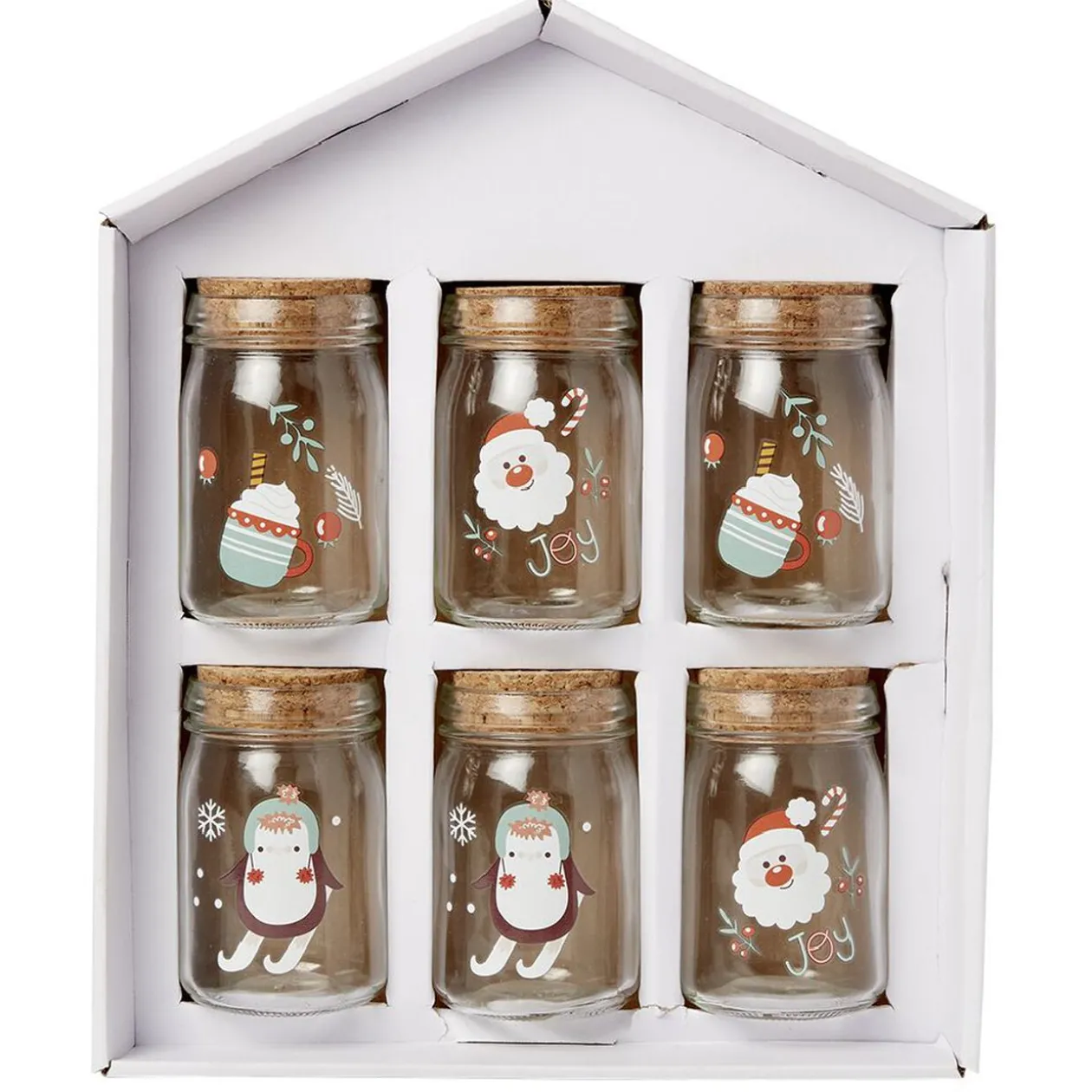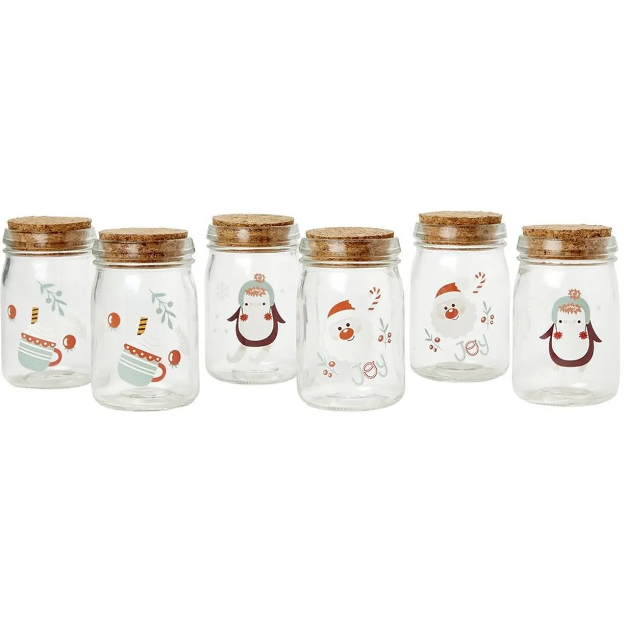 Lot de 6 mini-bocaux en verre transparent avec motif de Noël refermable par un couvercle en liège.