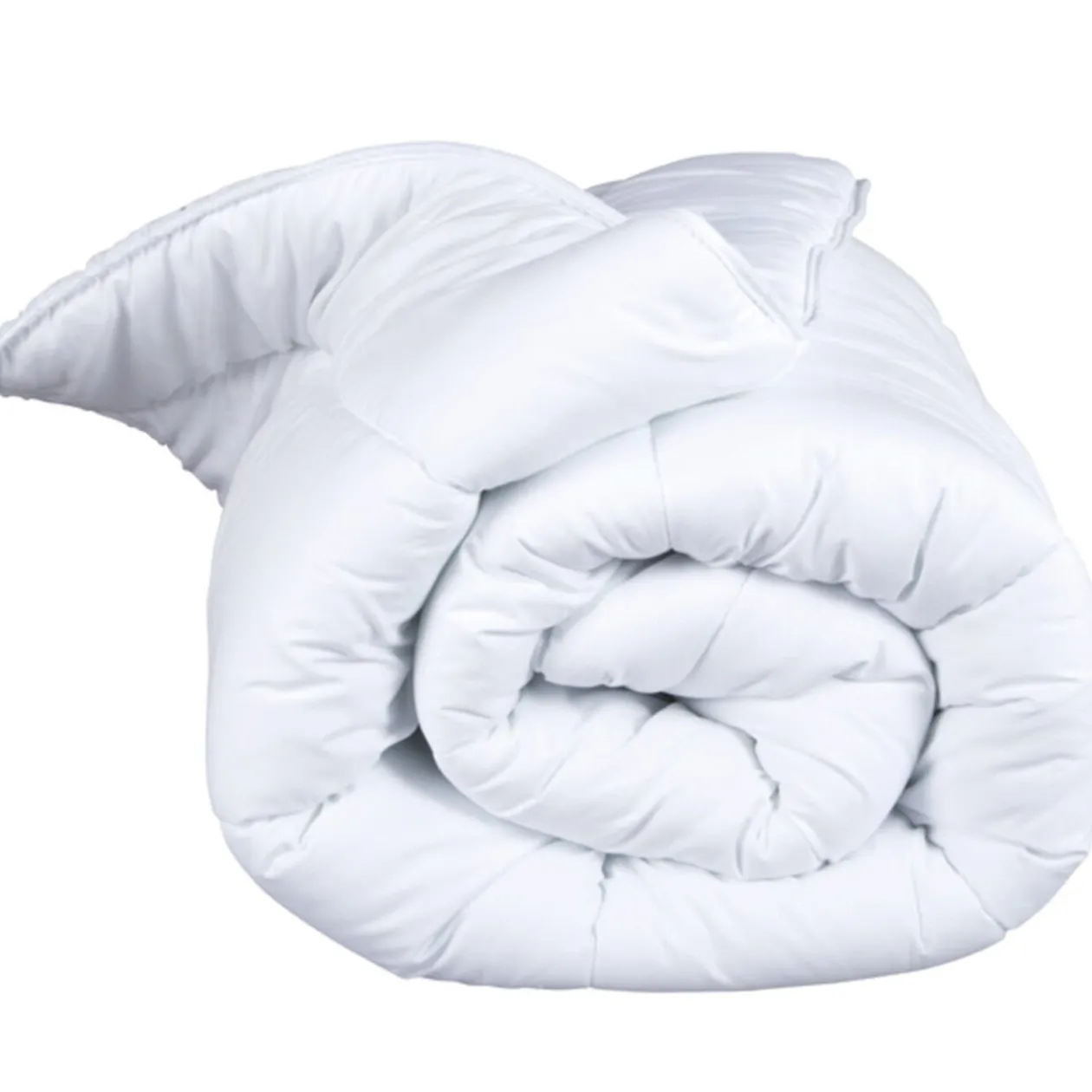 Couette 1 personne, dim. 140×200 cm, enveloppe 100 % polyester microfibre traité « linge propre », garnissage 100 % polyester fibres creuses siliconées.