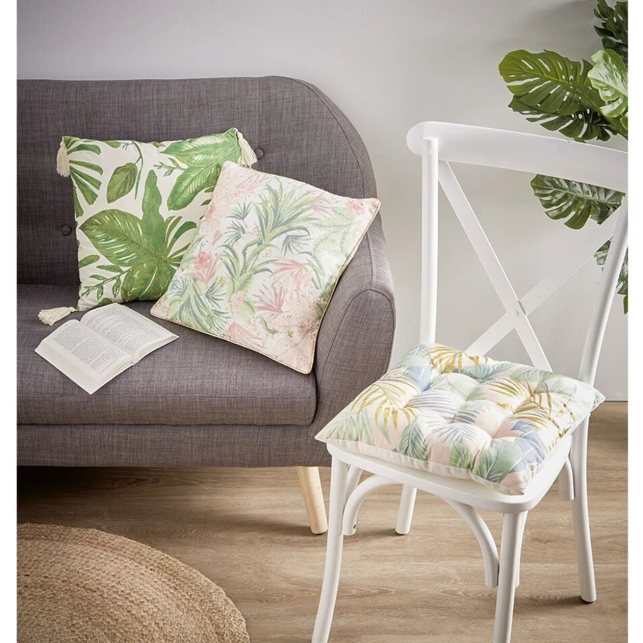 Joli coussin carré imprimé tropical en coton effet canevas et agrémenté d’un pompon aux 4 coins.