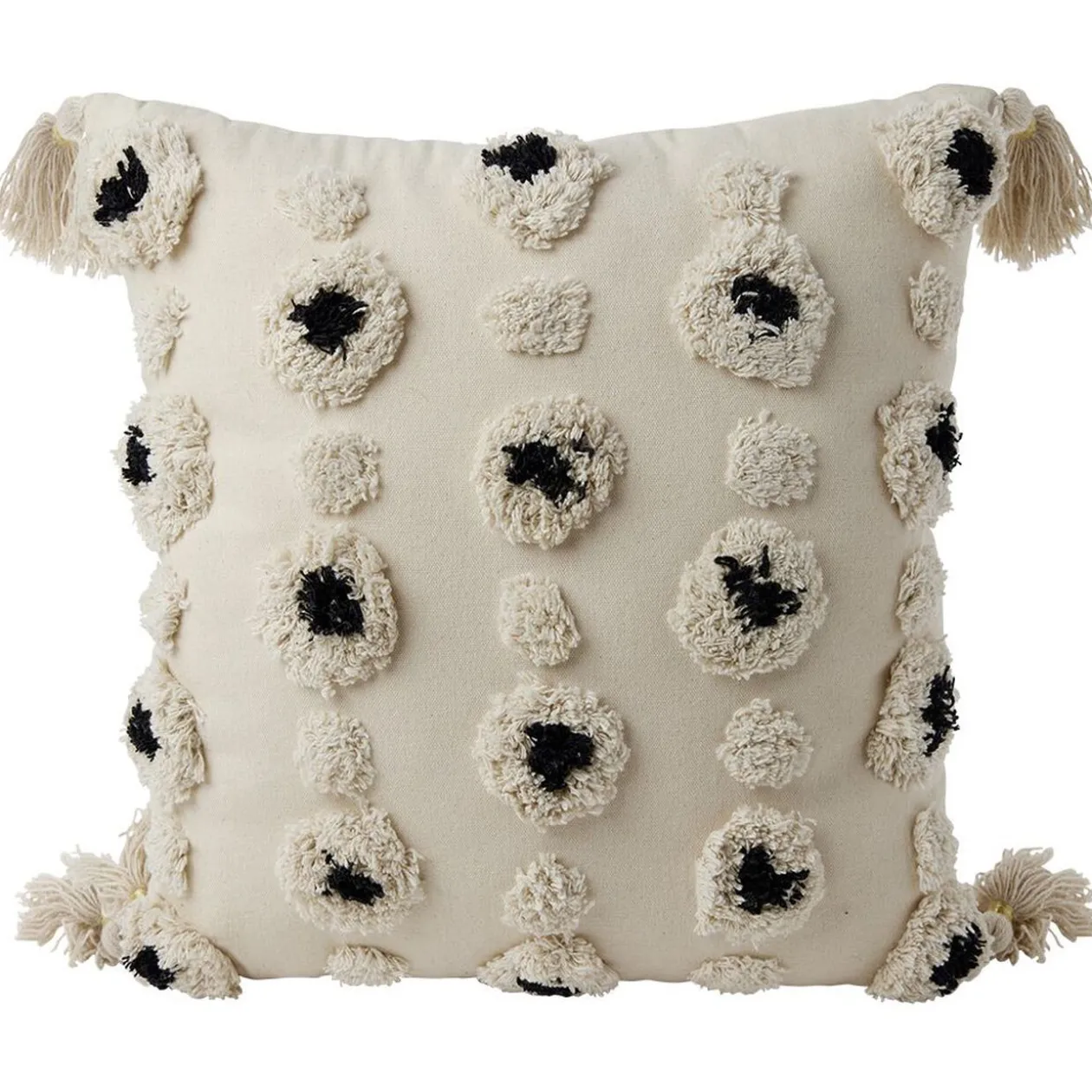 Ambiance cosy et tendance sur votre canapé grâce à ce coussin tufté beige et noir avec pompons.