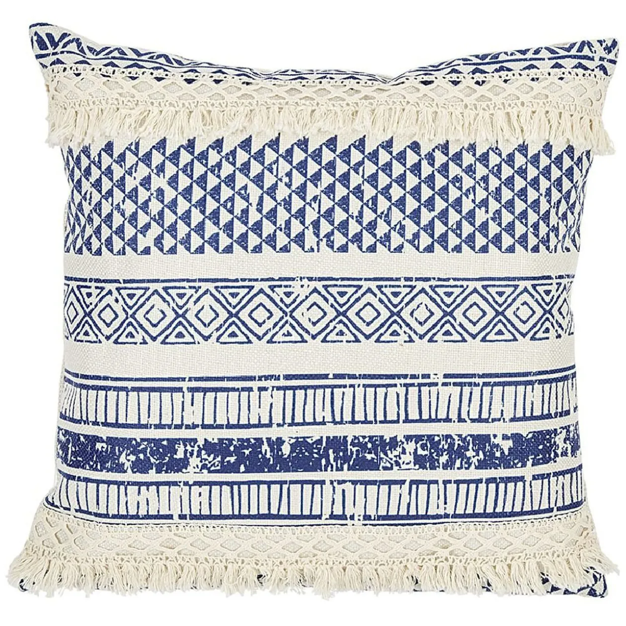 Apportez une touche de couleur et de fantaisie à votre canapé avec ce coussin à franges imprimé bleu et beige.