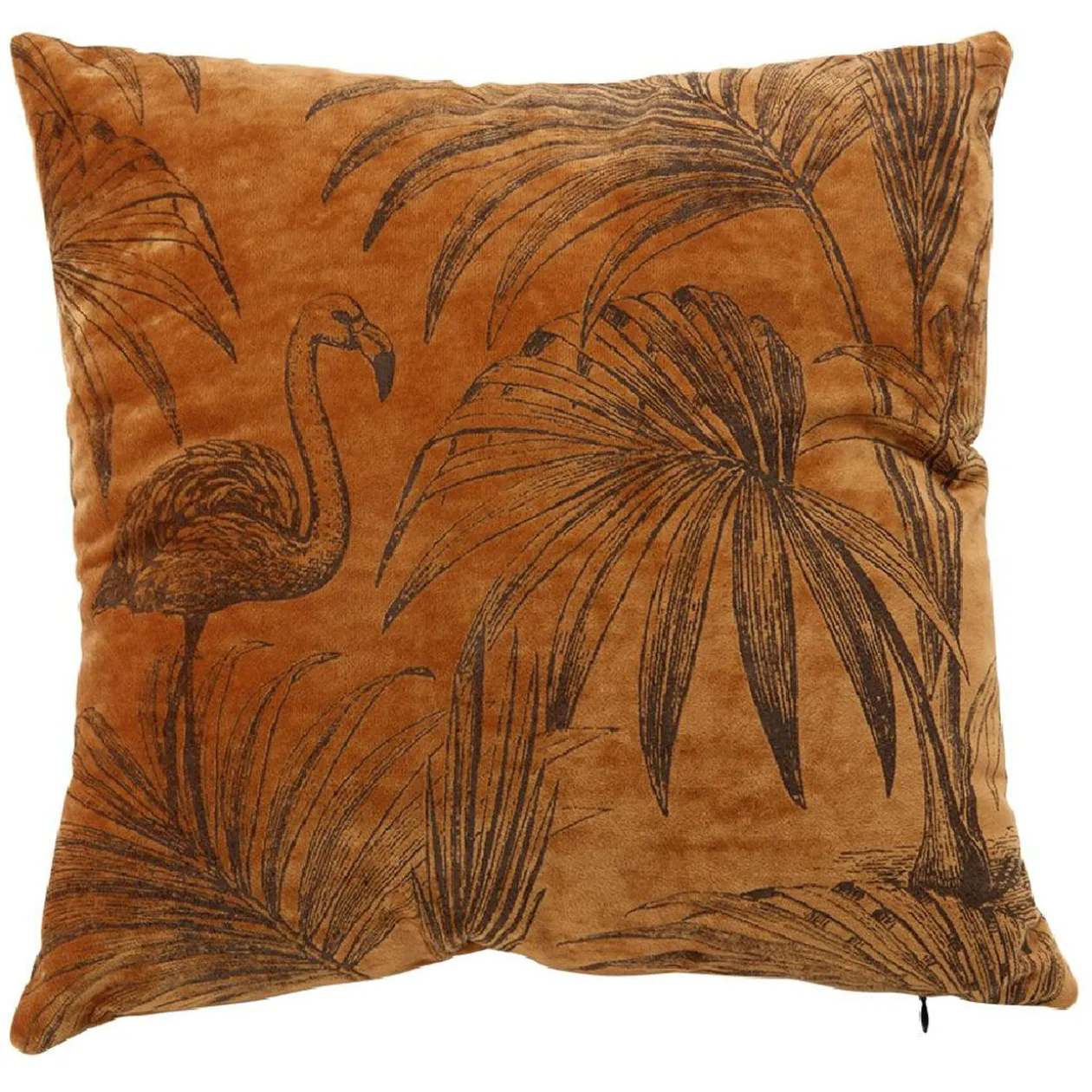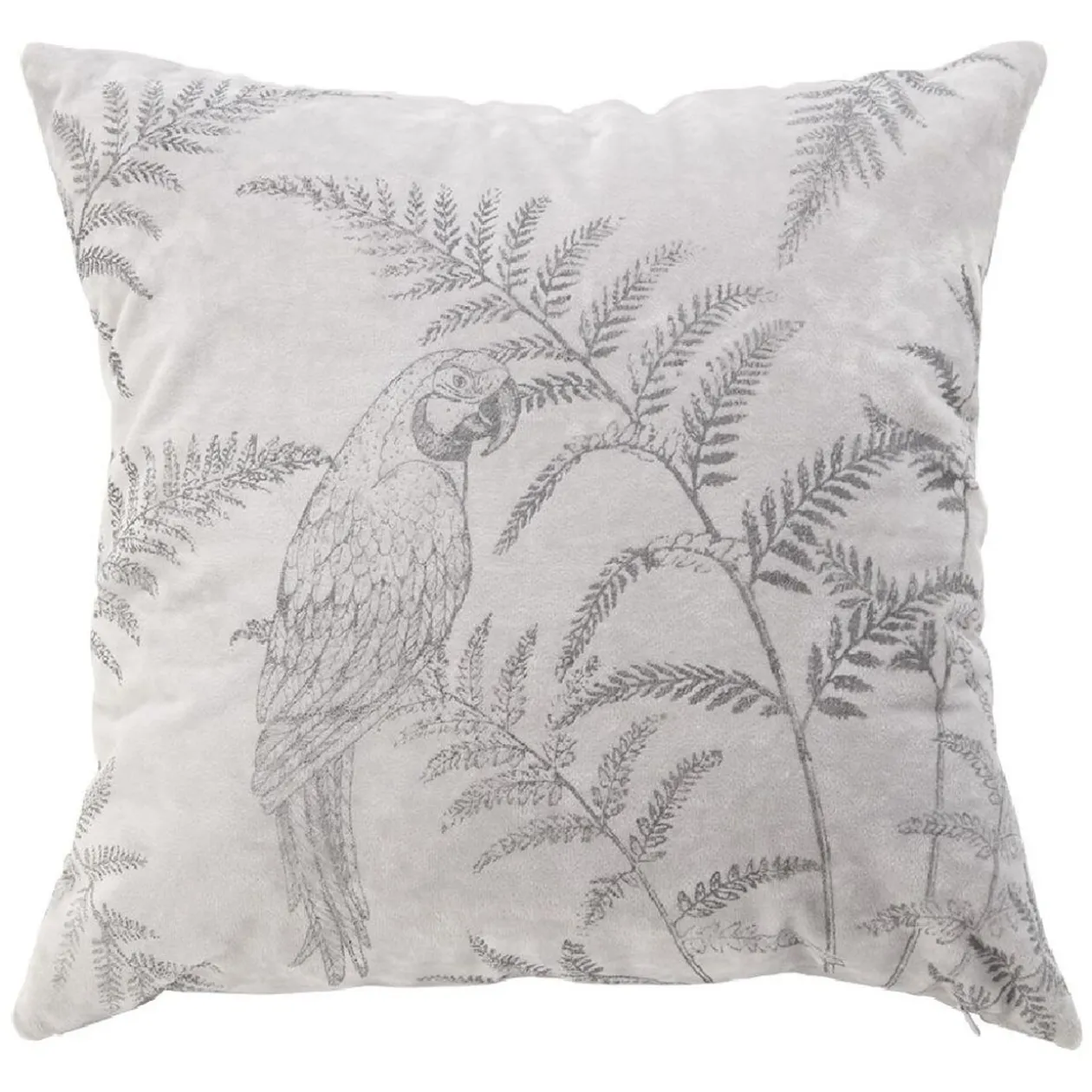 Coussin carré imprimé oiseaux exotiques ton sur ton, idéal pour agrémenter votre canapédans une ambiance tropicale.