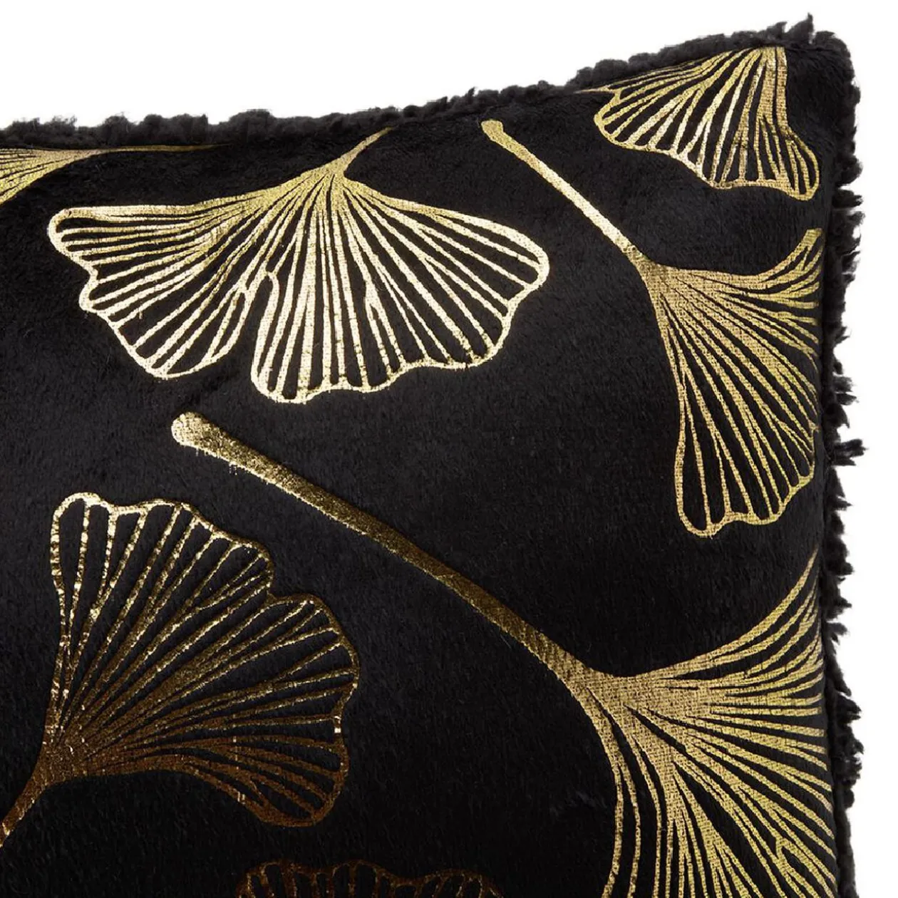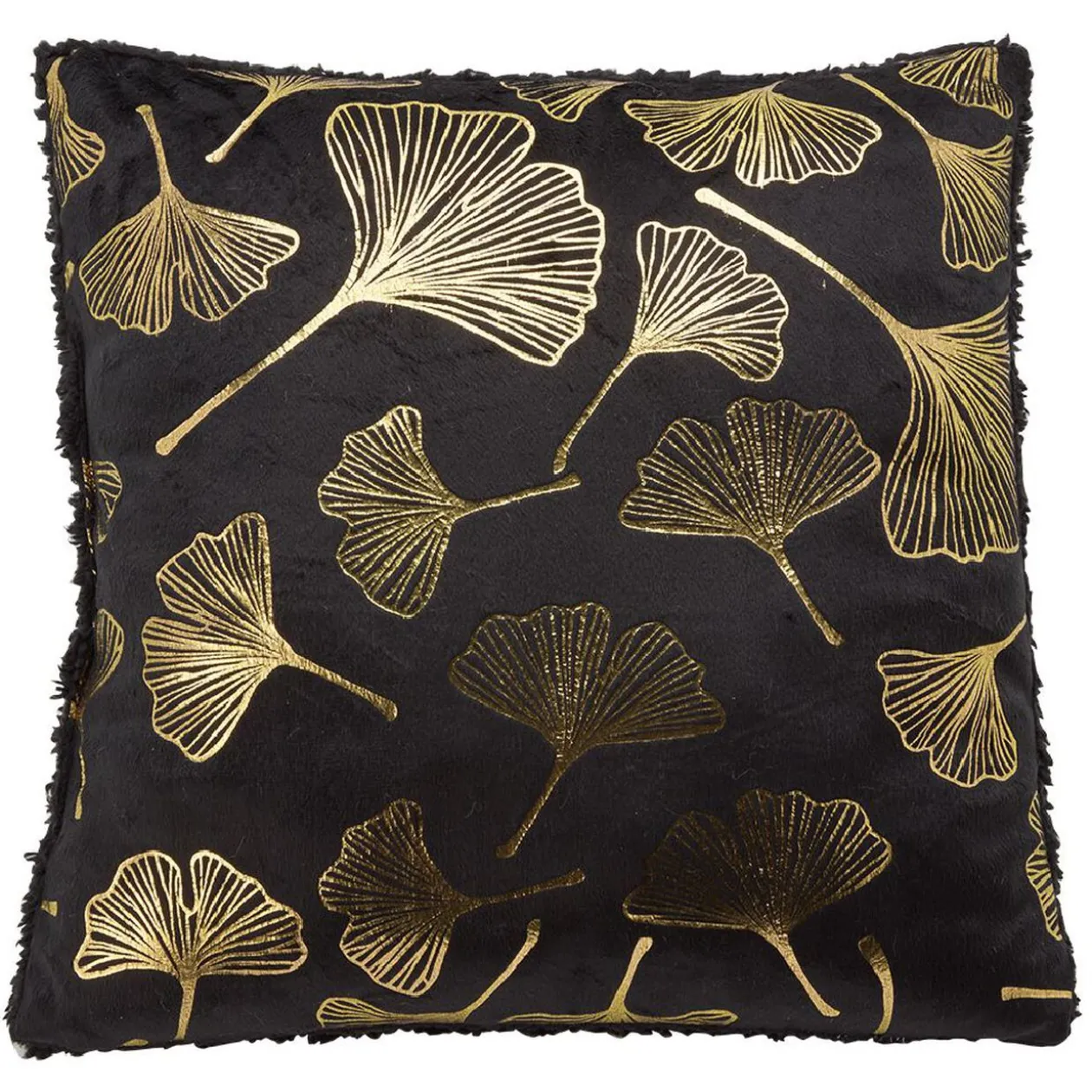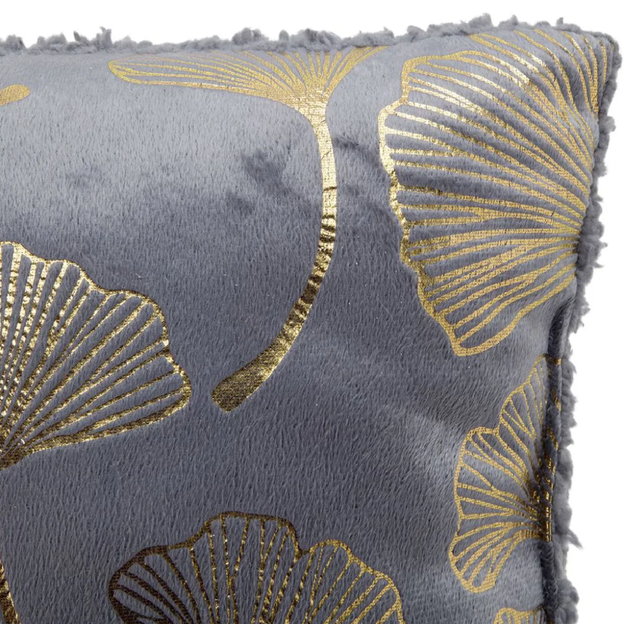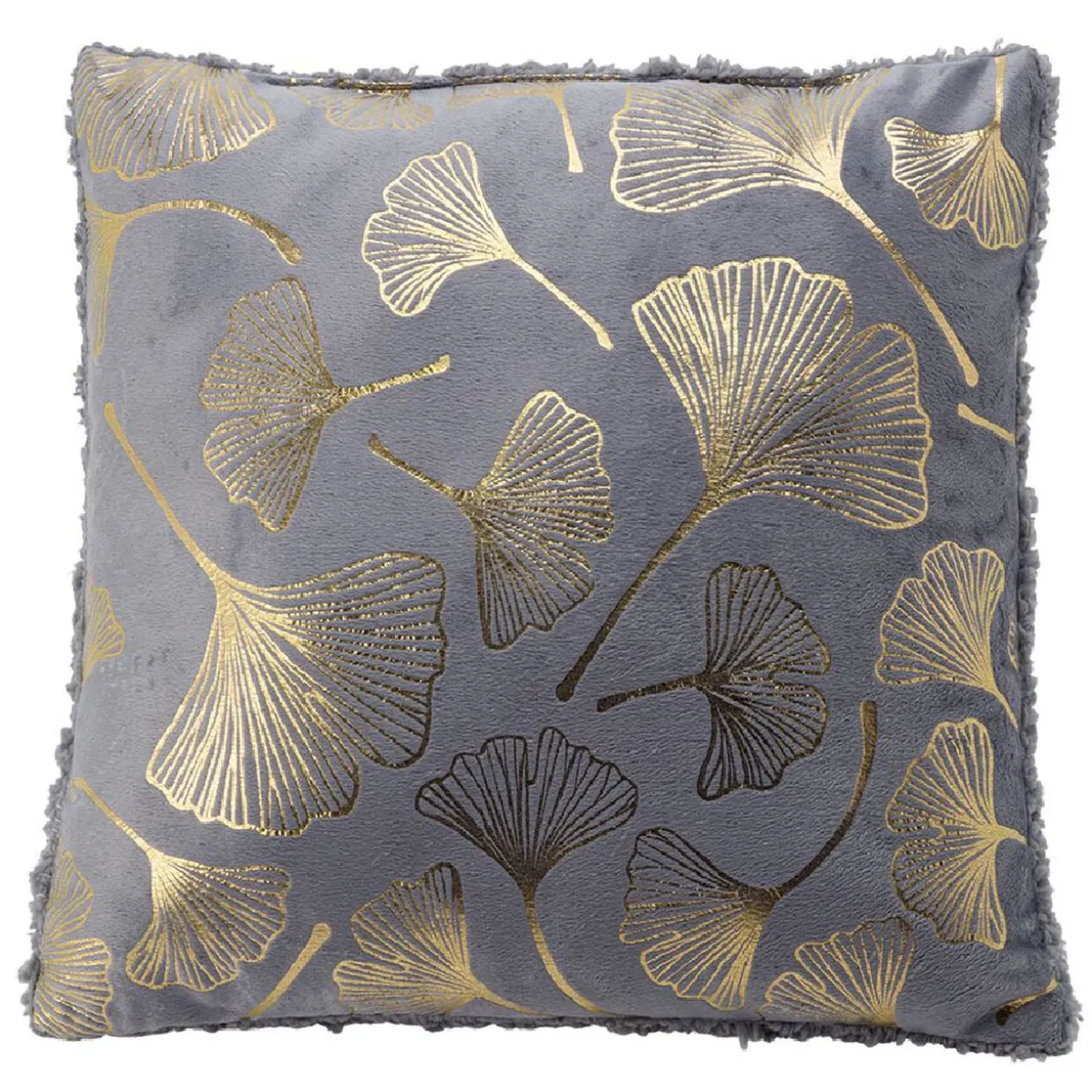 Coussin carré imprimé feuilles de lotus dorées avec dos sherpa, parfait pour agrémenter votre canapé dans un esprit cosy chic.