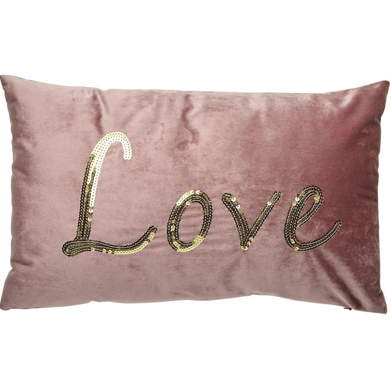 Coussin rectangulaire imitation velours de couleur vieux rose avec inscription dorée pailletée « Love » en sequins.