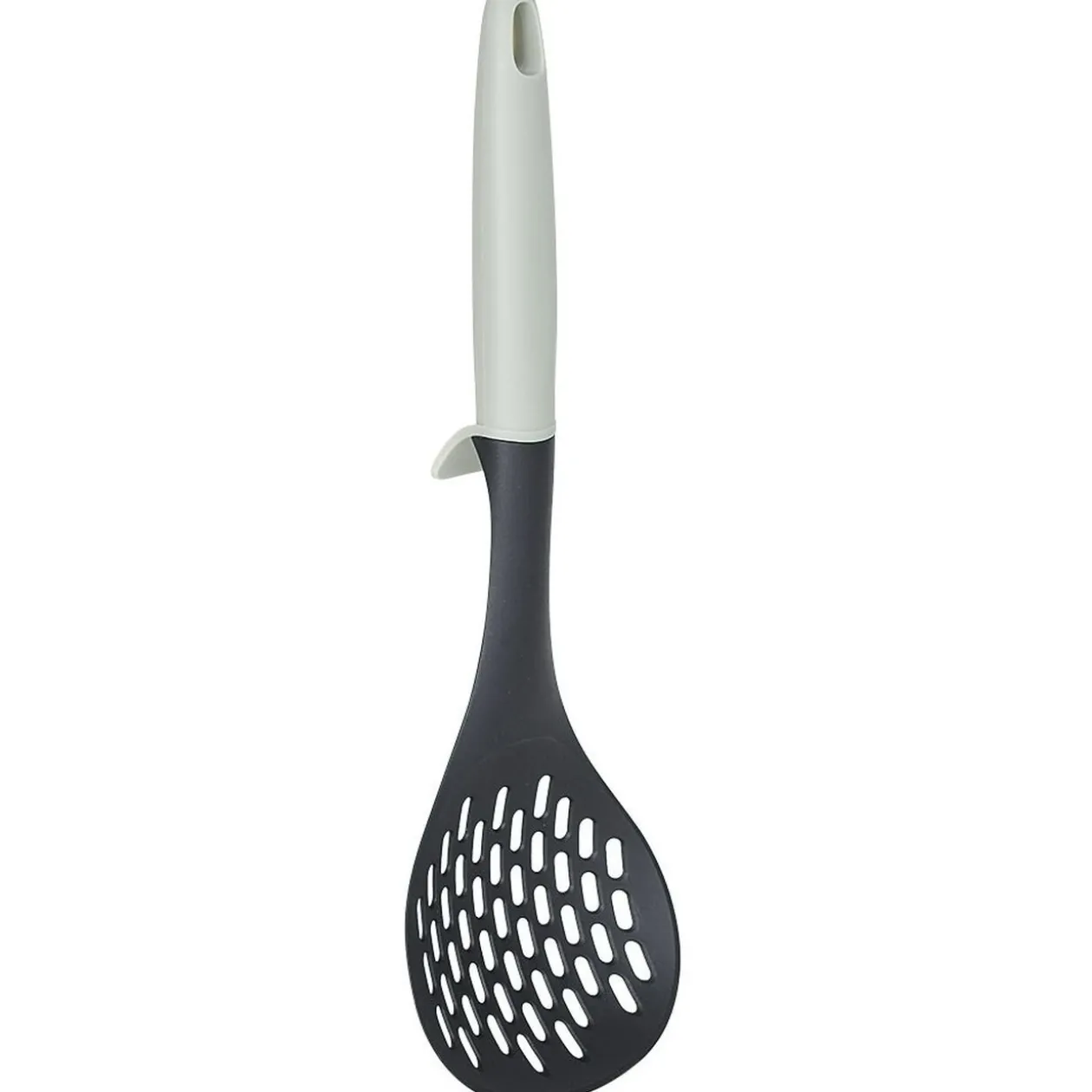 Écumoire en polyamide noir avec manche ergonomique gris.