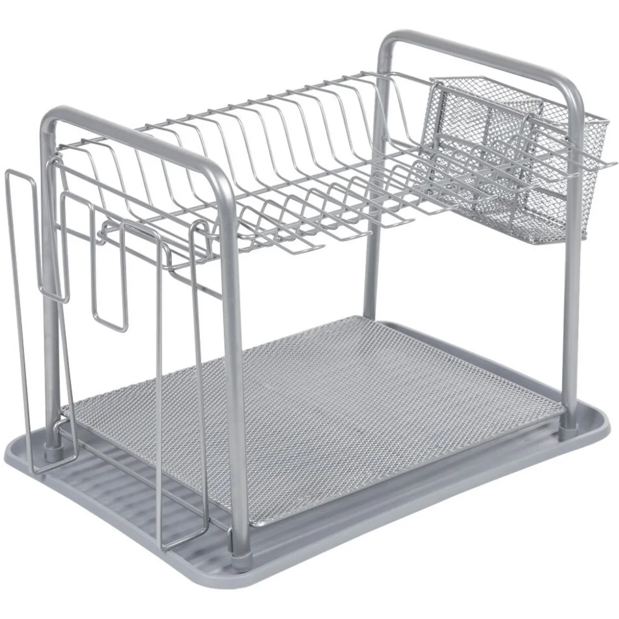 Egouttoir à vaisselle avec range-couverts en métal gris.