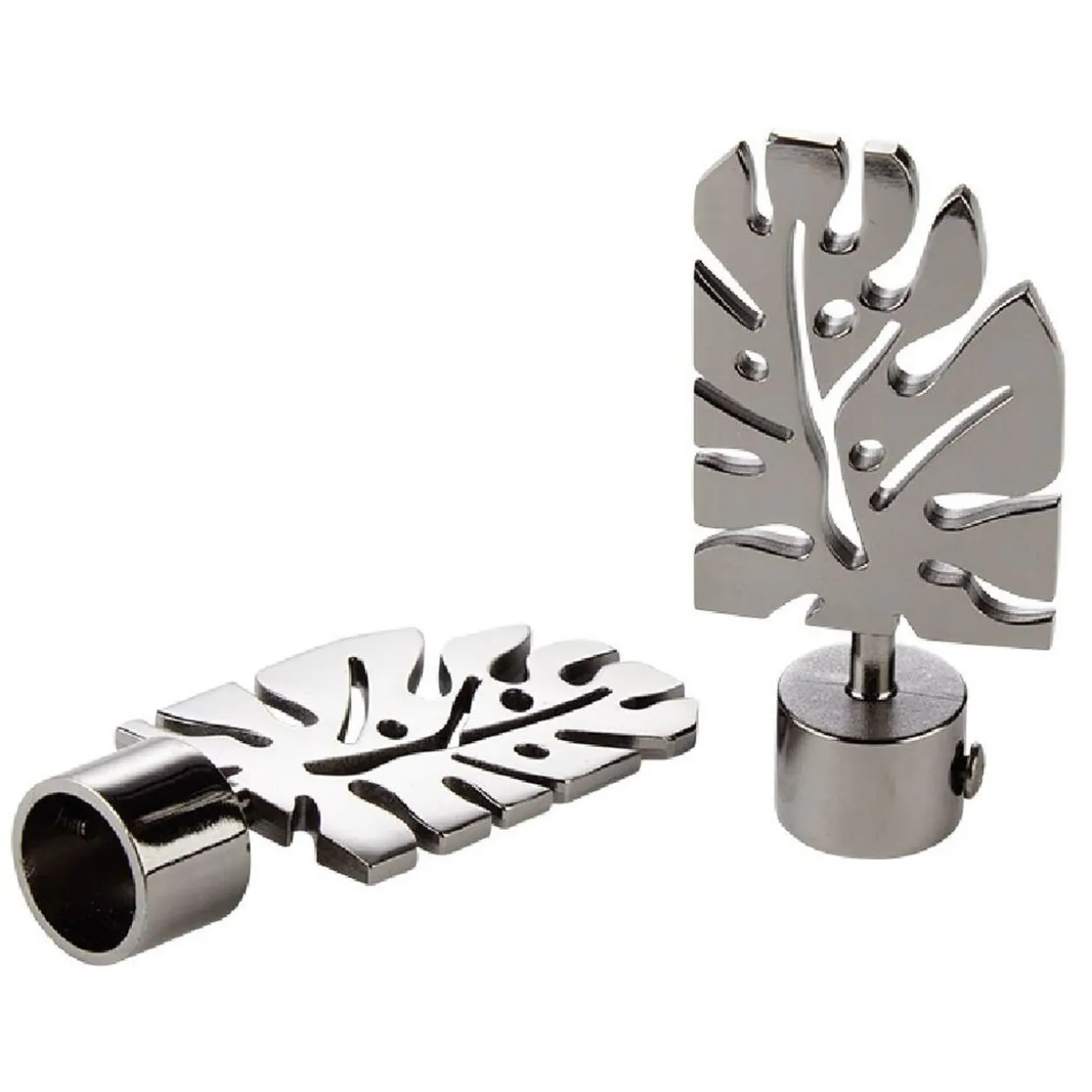 2 embouts pour tringle à rideau en forme de feuille argentée.