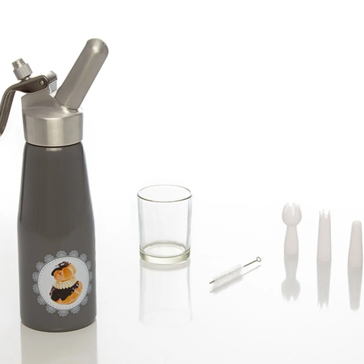 Coffret Gifibox siphon comprenant 1 siphon décoré 0,5 L, 3 embouts différents, 6 verrines, 1 goupillon de nettoyage et 1 livret de recettes.