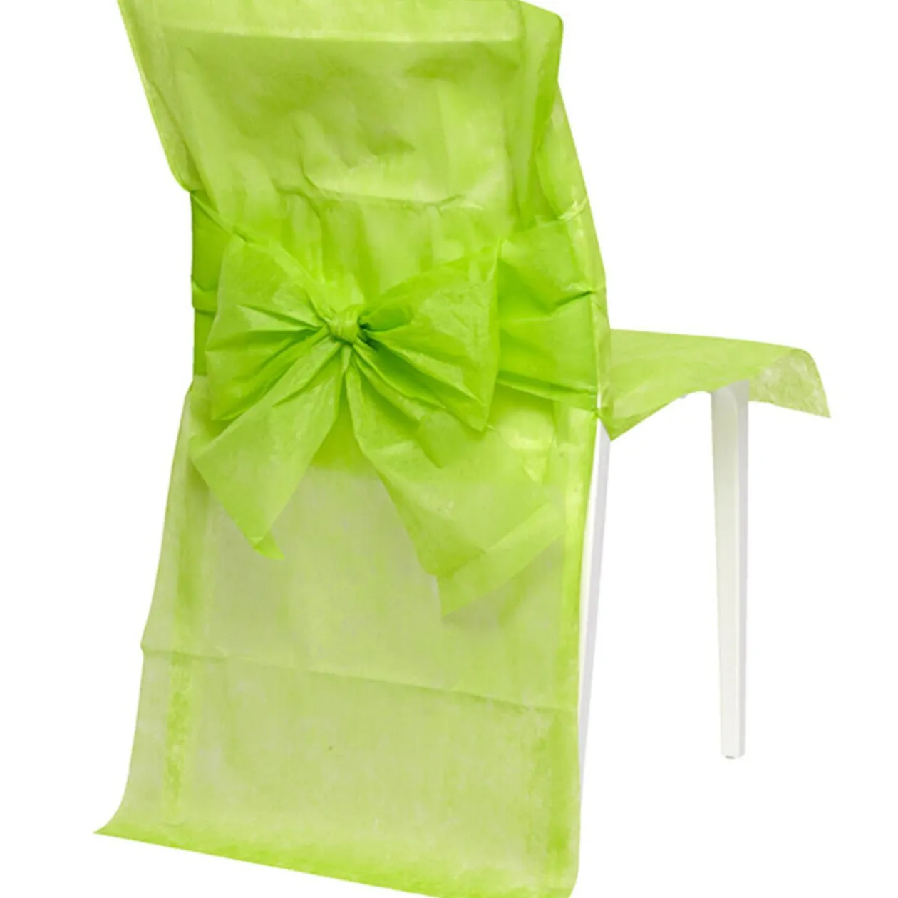 10 housses de chaise vertes anis, noeud inclus, dim. 50xh.92 cm, tissu non tissé. Peut s’utiliser en décoration de salle pour mariage, baptême ou autre évènement.