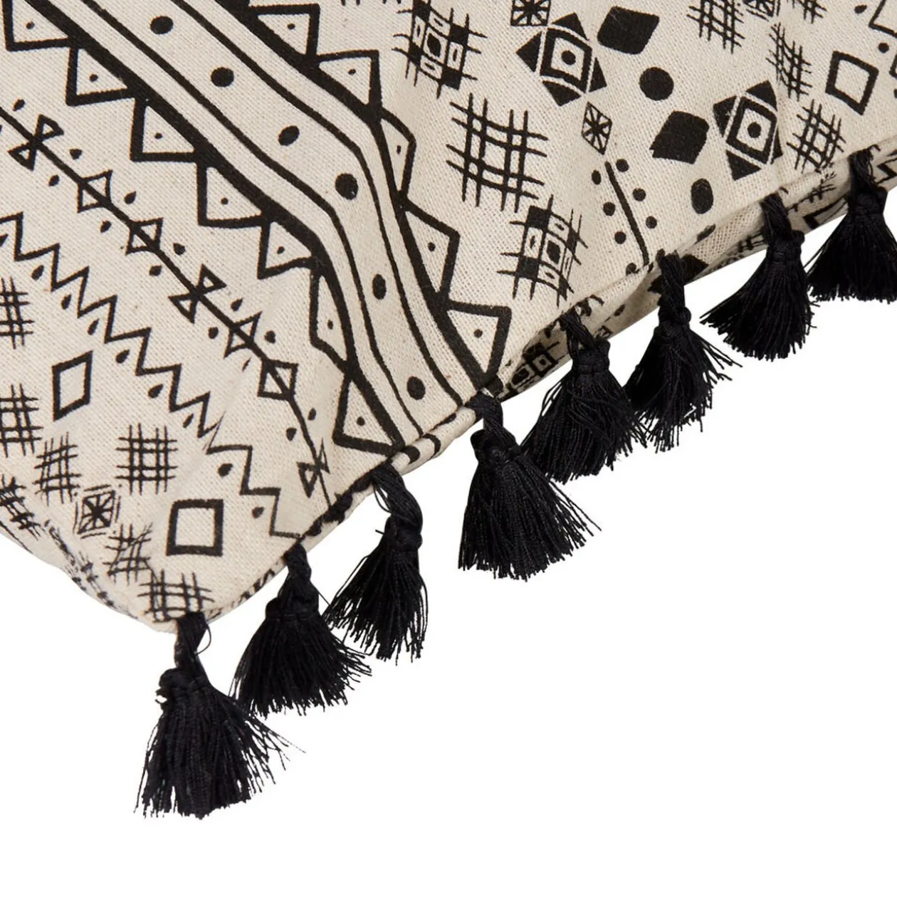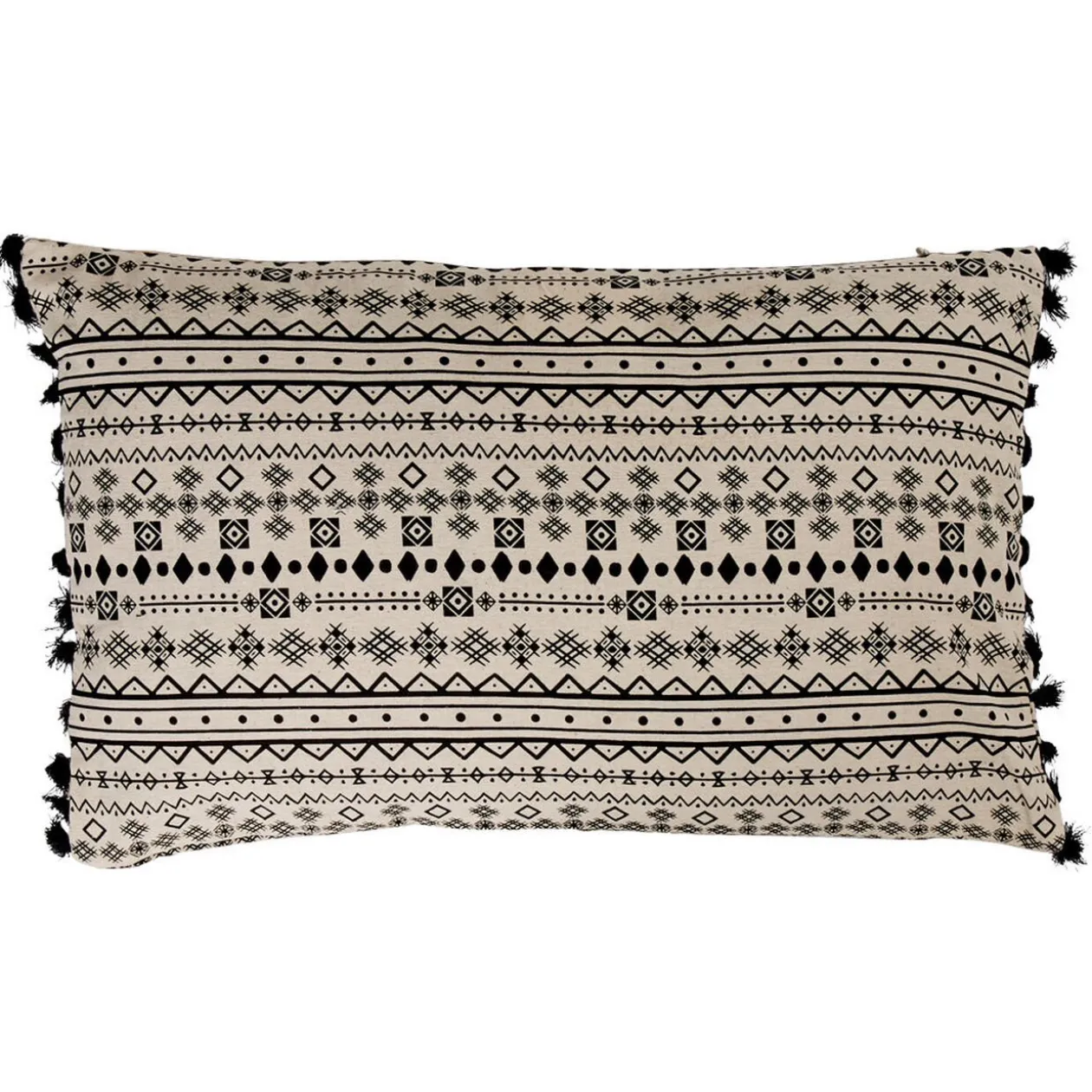 Housse de coussin rectangulaire avec des rangées de pompons noirs. Coloris noir et blanc avec motif tropical. Nous vous proposons la housse de coussin carrée assortie (référence 505605) ainsi que le jeté de canapé (référence : 507647) pour agrémenter votre déco de salon.