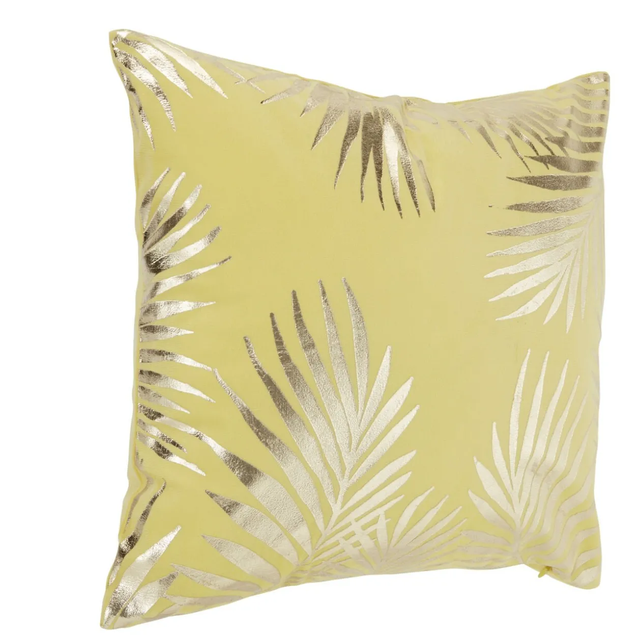 Housse de coussin suédine de couleur jaune moutarde décorée d’un motif argenté.