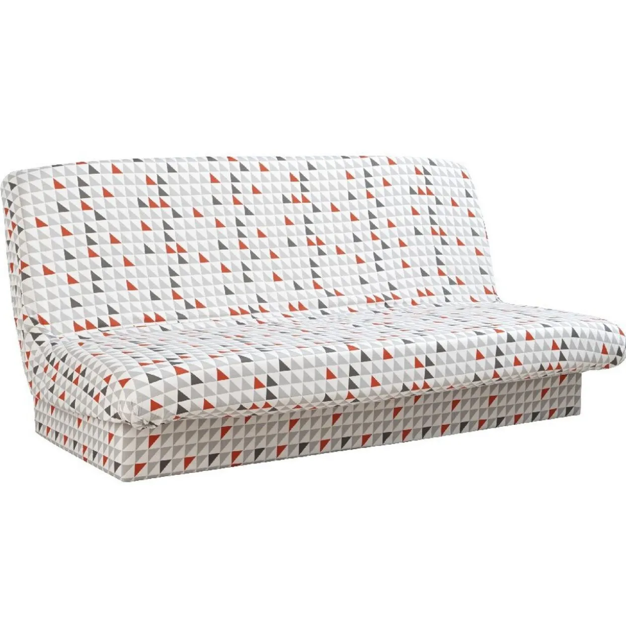 Housse pour canapé-lit avec bande de socle, fond gris et design triangles rouges et gris, dim. 195xh.70×60 cm, 70 % polyester et 30 % coton.