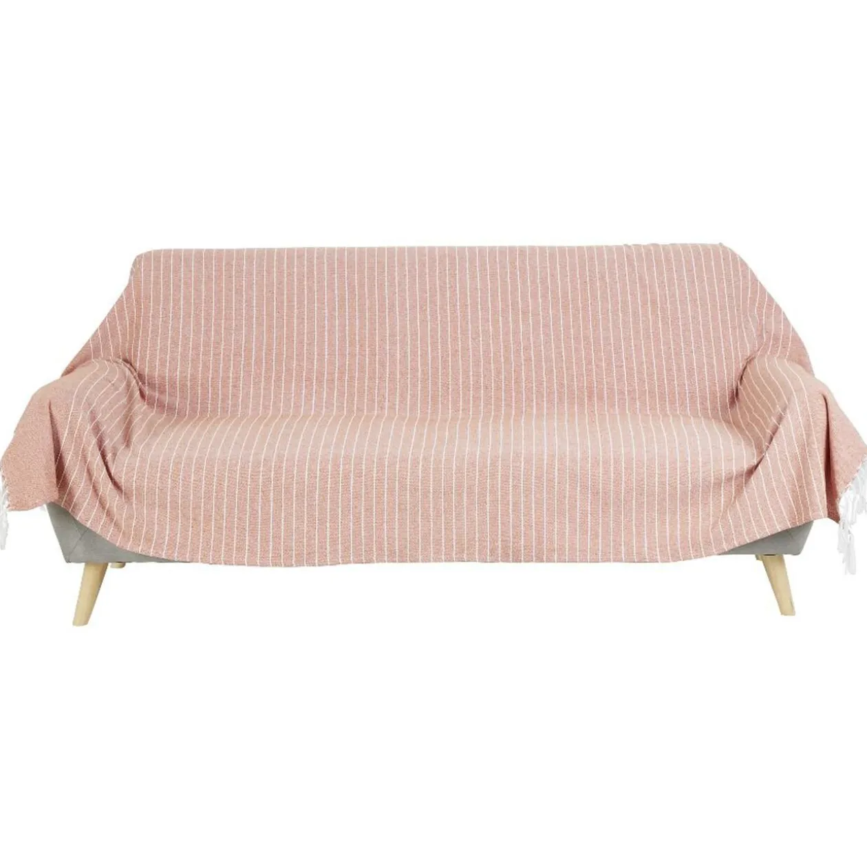 Jeté de canapé à rayures blanches avec franges aux deux extrémités, idéal pour le salon ou sur le sofa dans un bureau.