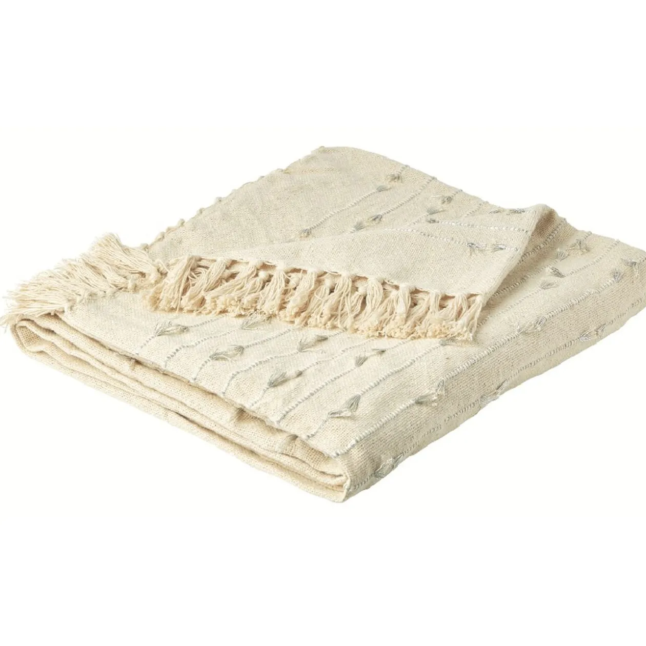 Ce jeté de canapé à franges de couleur blanc écru avec fil brillant sera idéal pour agrémenter votre coin salon et y apporter une légère touche décorative.