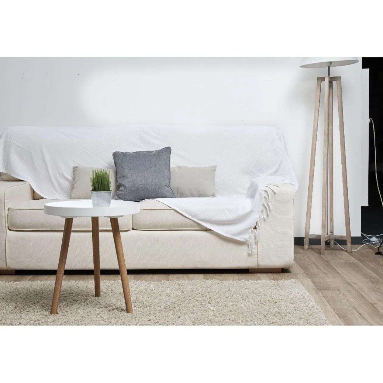 Agrémentez votre coin salon avec un jeté de canapé à franges uni de couleur blanche.