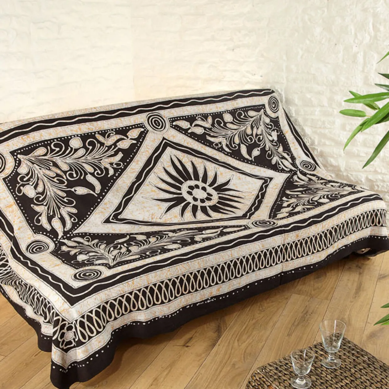 Jeté de canapé, motif ethnique, de couleur blanc et noir avec des tâches jaunes.