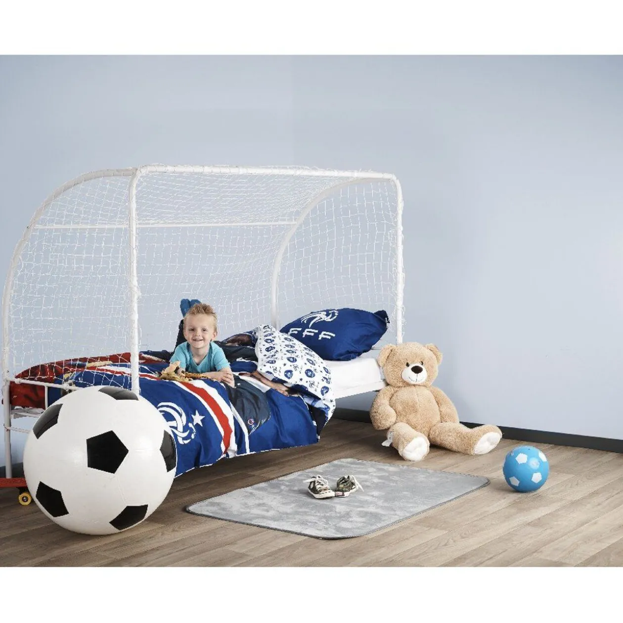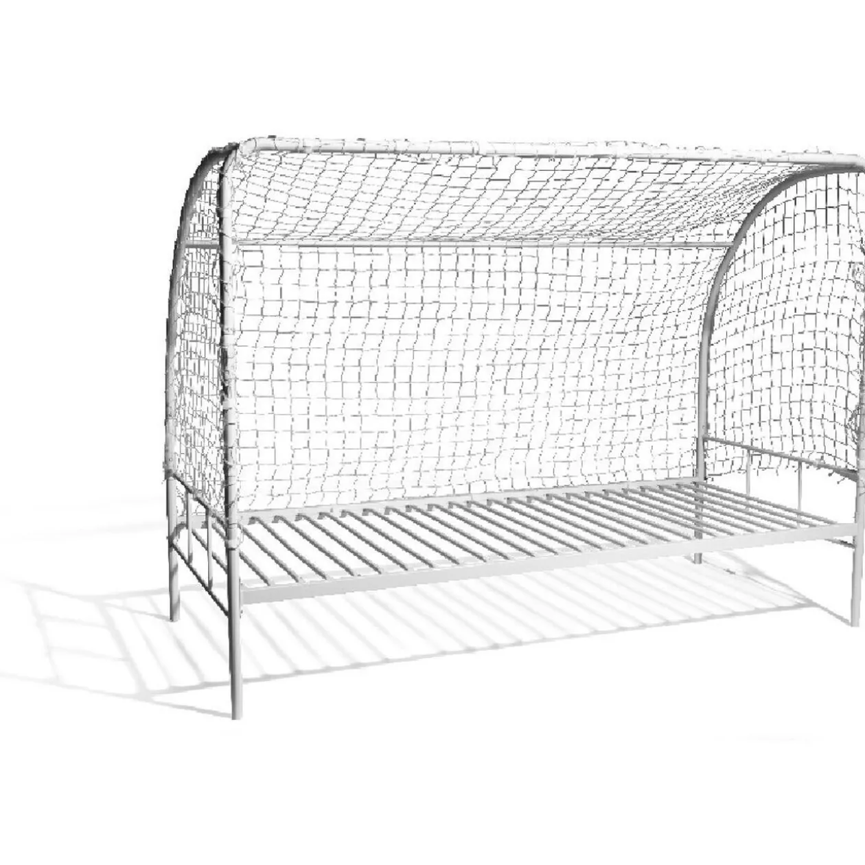 Lit goal en forme de cage de foot, dim. 197x94x152 cm, cadre métal, finition peinture époxy, filet en polypropylène.