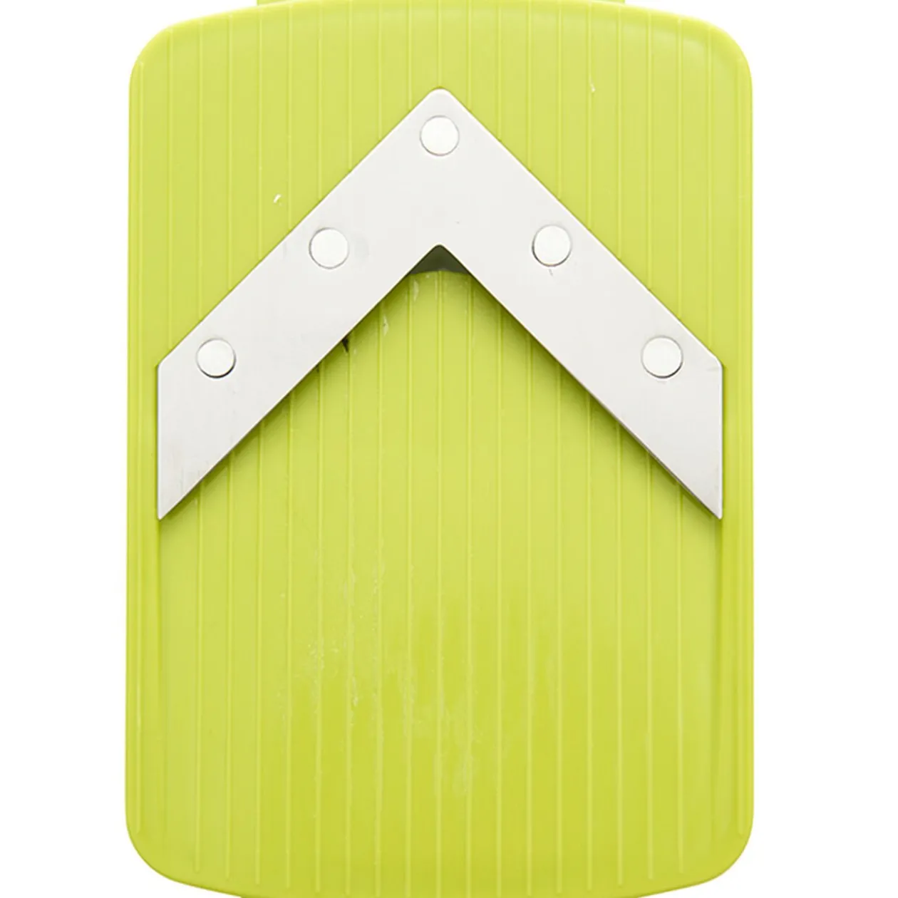 Mandoline et découpe-légumes, 6 coupes disponibles (râper finement, râper grossièrement, râper en julienne, trancher et 2 tailles de cubes). Dim. 17x12x7/9 cm, plastique.