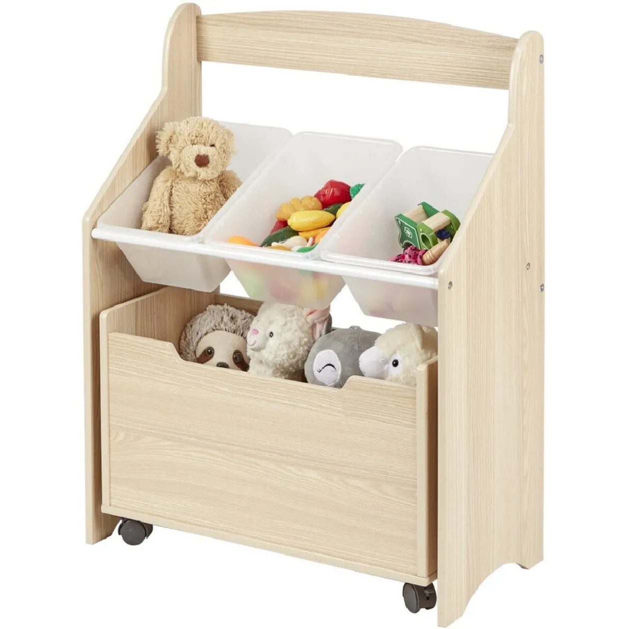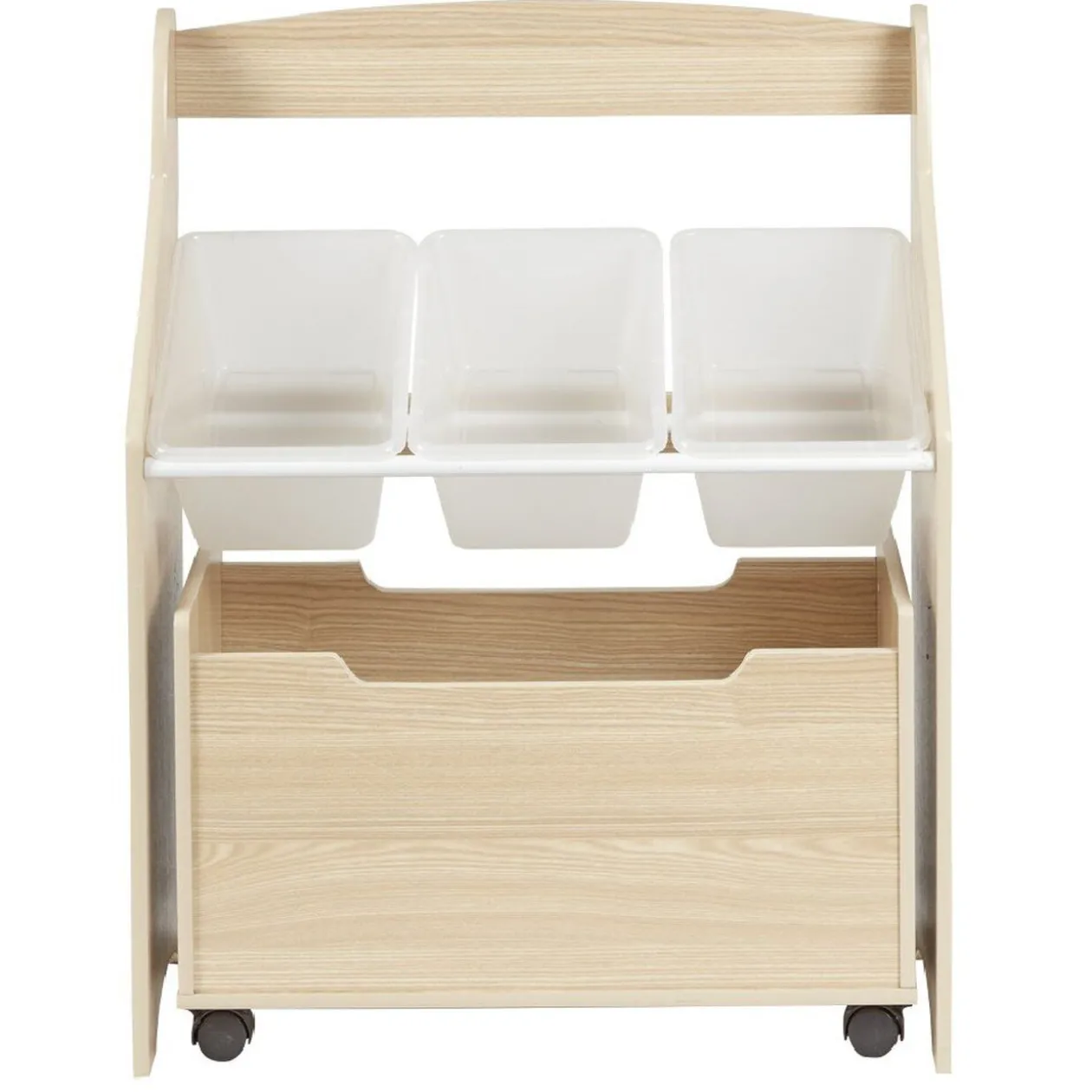 Polyvalent et design, ce joli meuble de rangement en MDF (panneau de fibres de bois) se compose d’un bac en contreplaqué naturel sur roulettes et de 3 casiers en mélaminé transparent. Idéal pour organiser les jouets et livres dans la salle de jeux ou dans la chambre de votre enfant