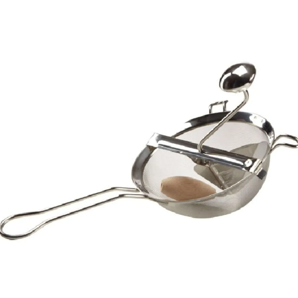 Moulin à coulis Ø 20 cm, l. 39 cm, tamis maille fine, inox, 2 crochets.