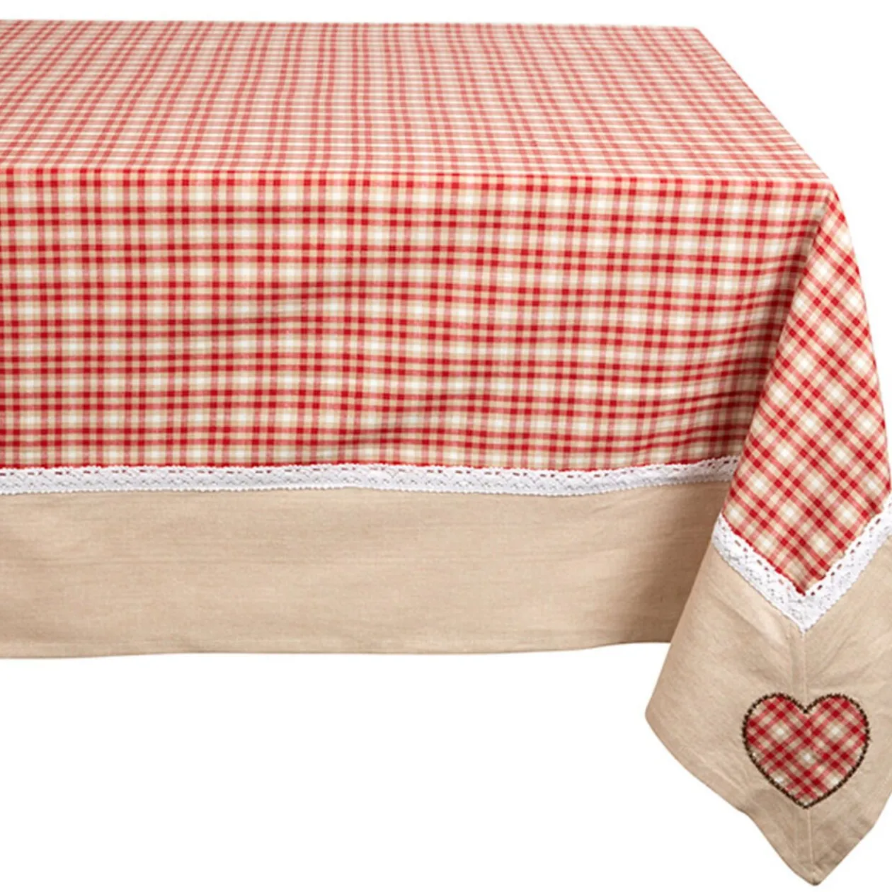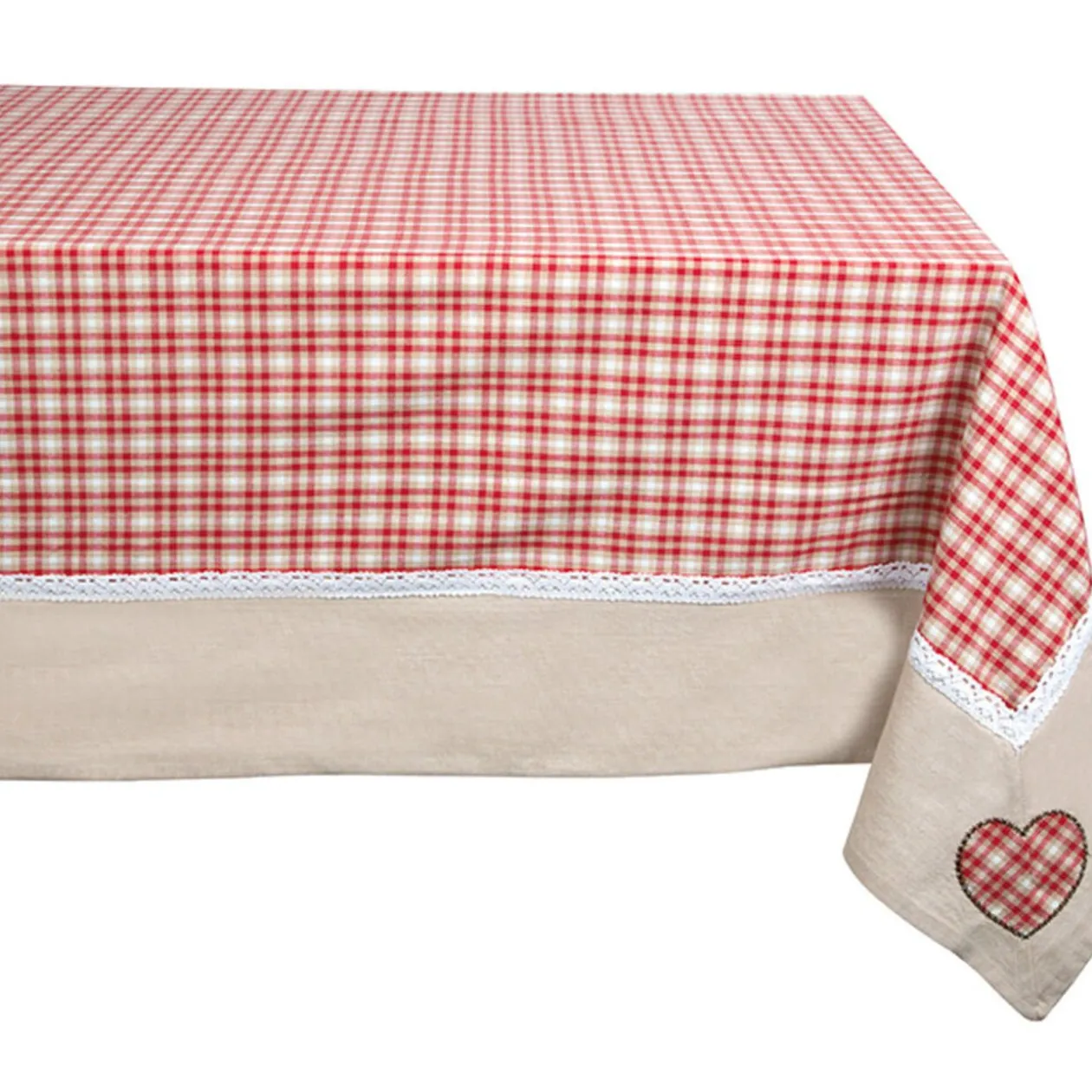 Nappe de table rectangulaire beige et rouge à carreaux, dim. 140×250 cm, coton.