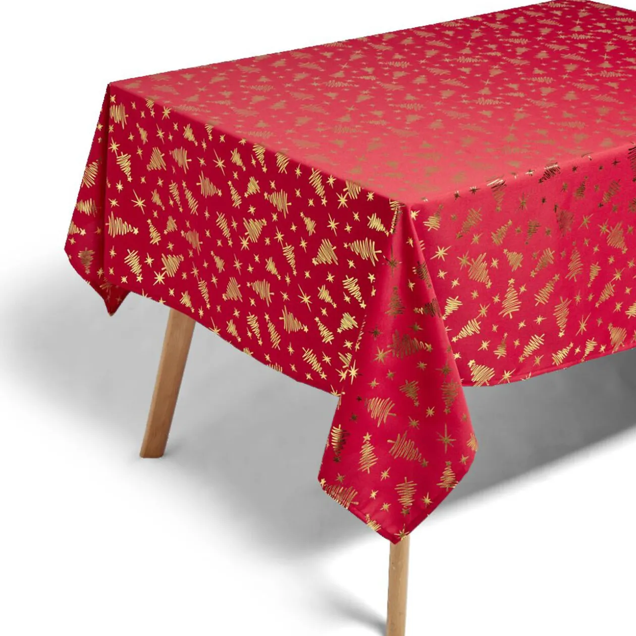 Apportez une ambiance festive à votre table avec cette nappe en tissu rouge ornée de motifs sapins dorés.