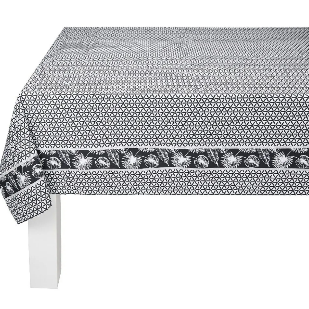 Mixez les styles déco avec cette nappe au motif géométrique noir et blanc et une bordure inattendue avec un imprimé feuillage tropical.