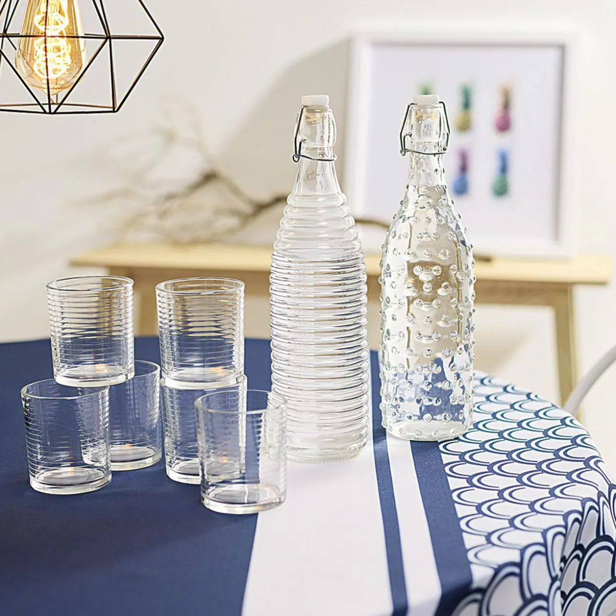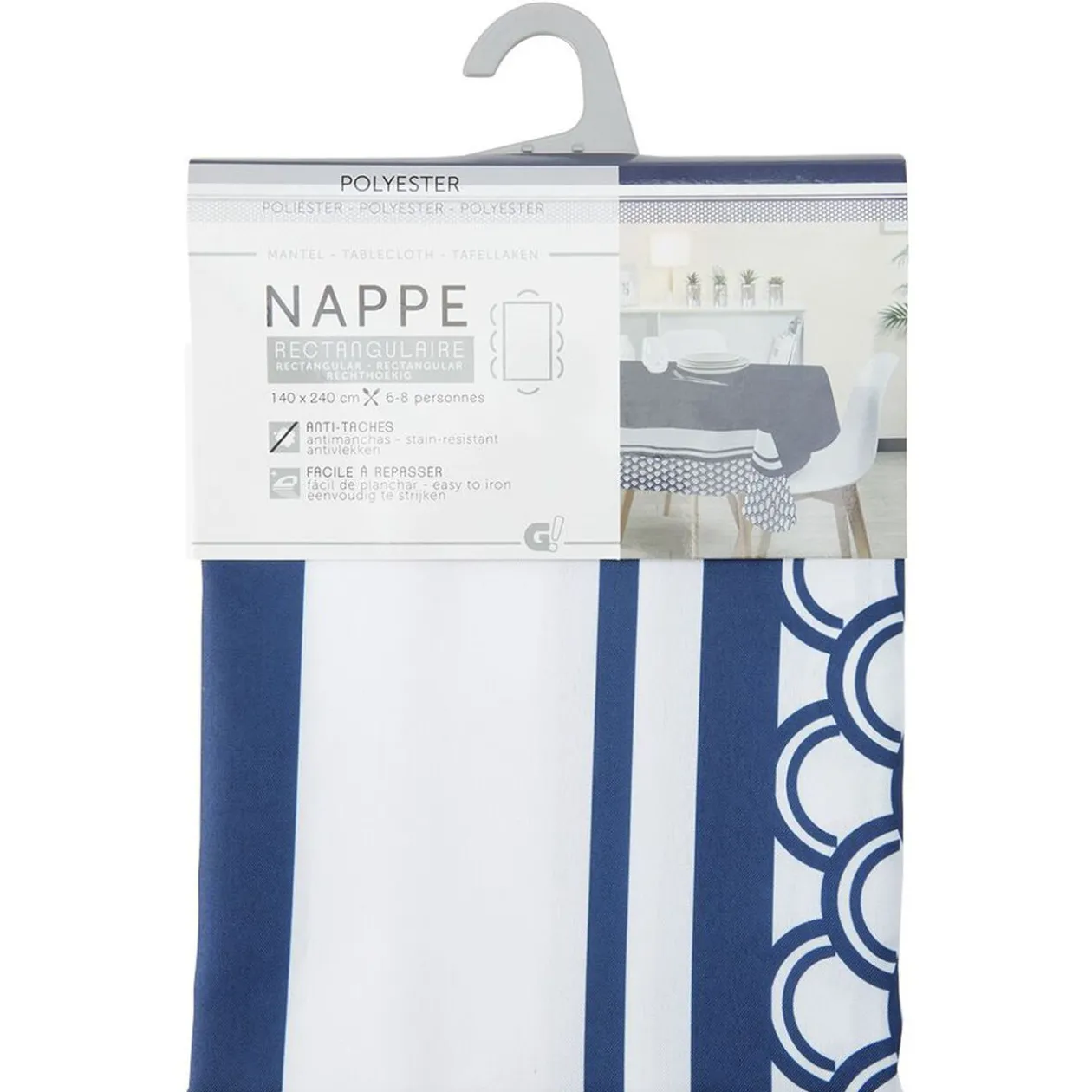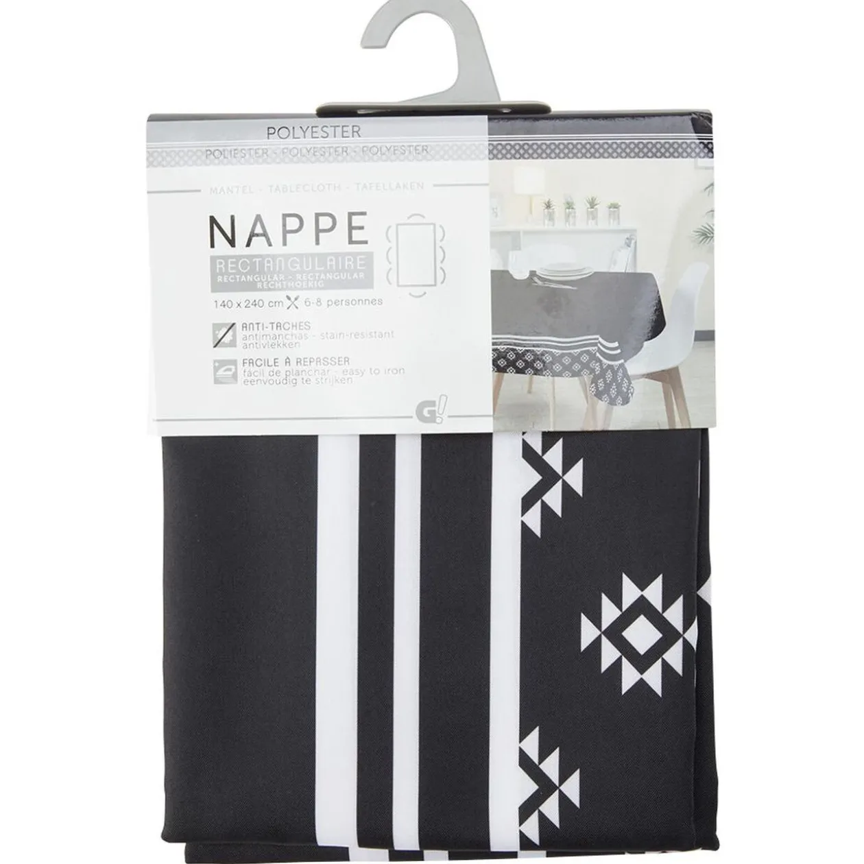 Nappe de table rectangulaire pour 6/8 couverts, de couleur bleu/blanc ou noir/blanc à motifs. Disponibilité des coloris selon stock en magasin.