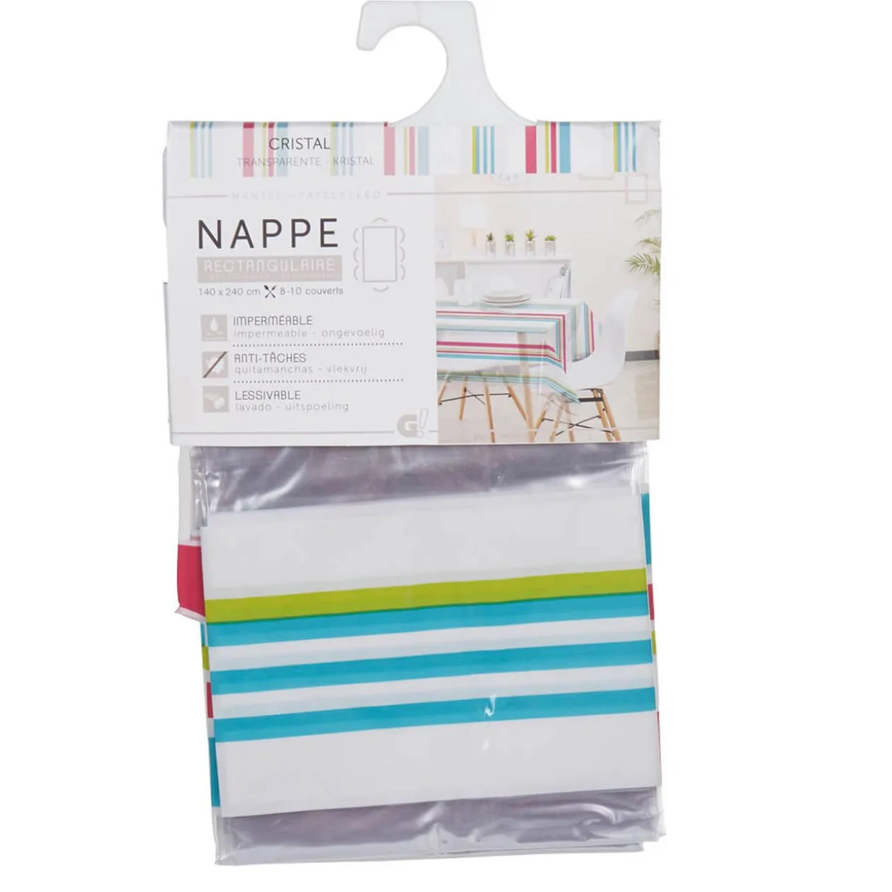 Nappe rectangulaire transparente motifs rayures multicolores.