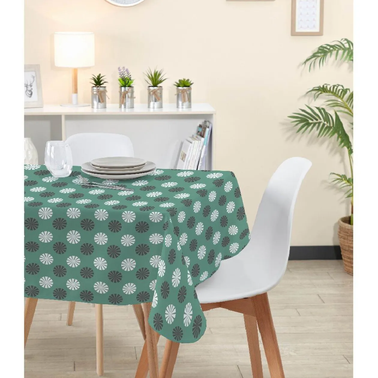 Nappe rectangulaire en polyester vert imprimé de motifs ronds blancs et gris, décorative et facile d’entretien.