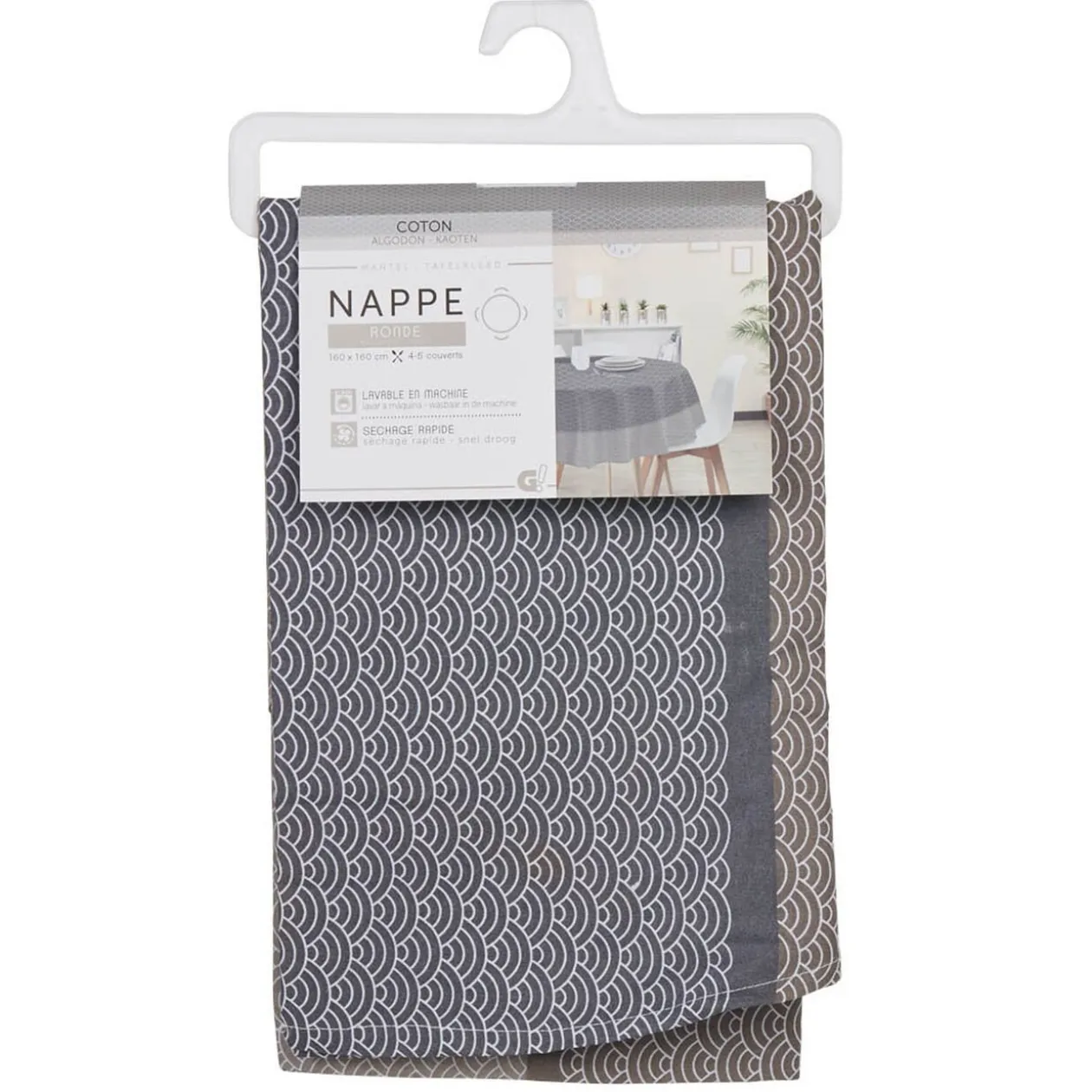 Nappe de table ronde de couleur taupe et grise motif graphique.