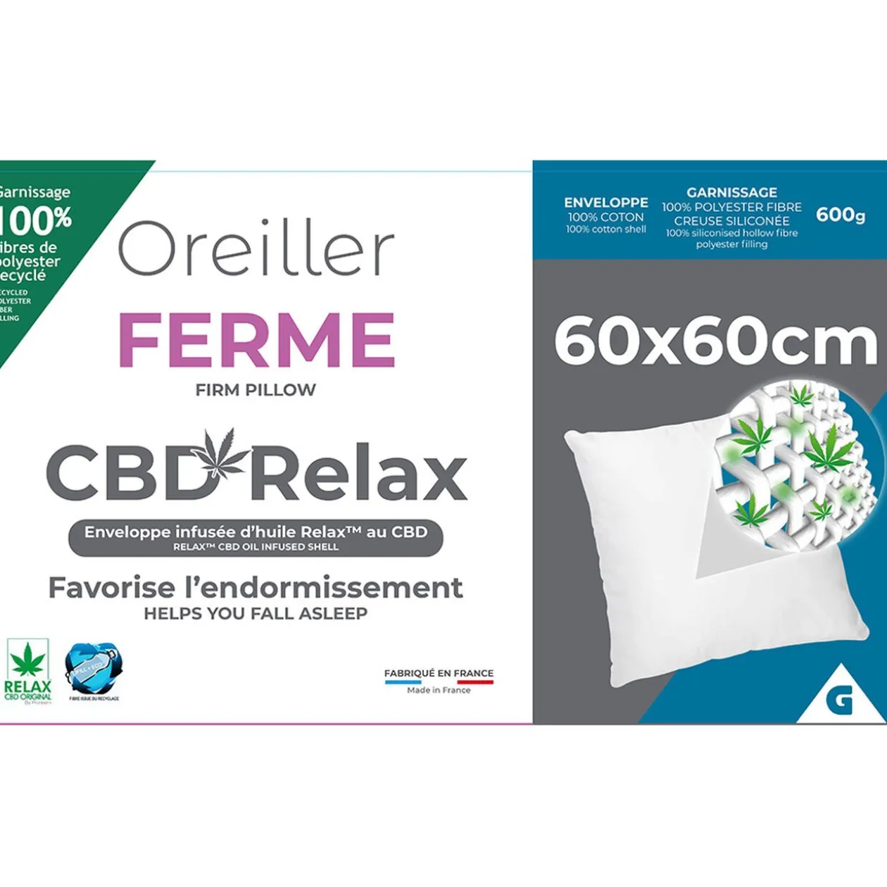 Cet oreiller carré au confort ferme est doté d’une enveloppe infusée d’huile Relax™ au CBD favorisant l’endormissement. Idéal pour un sommeil beaucoup plus confortable et récupérateur.