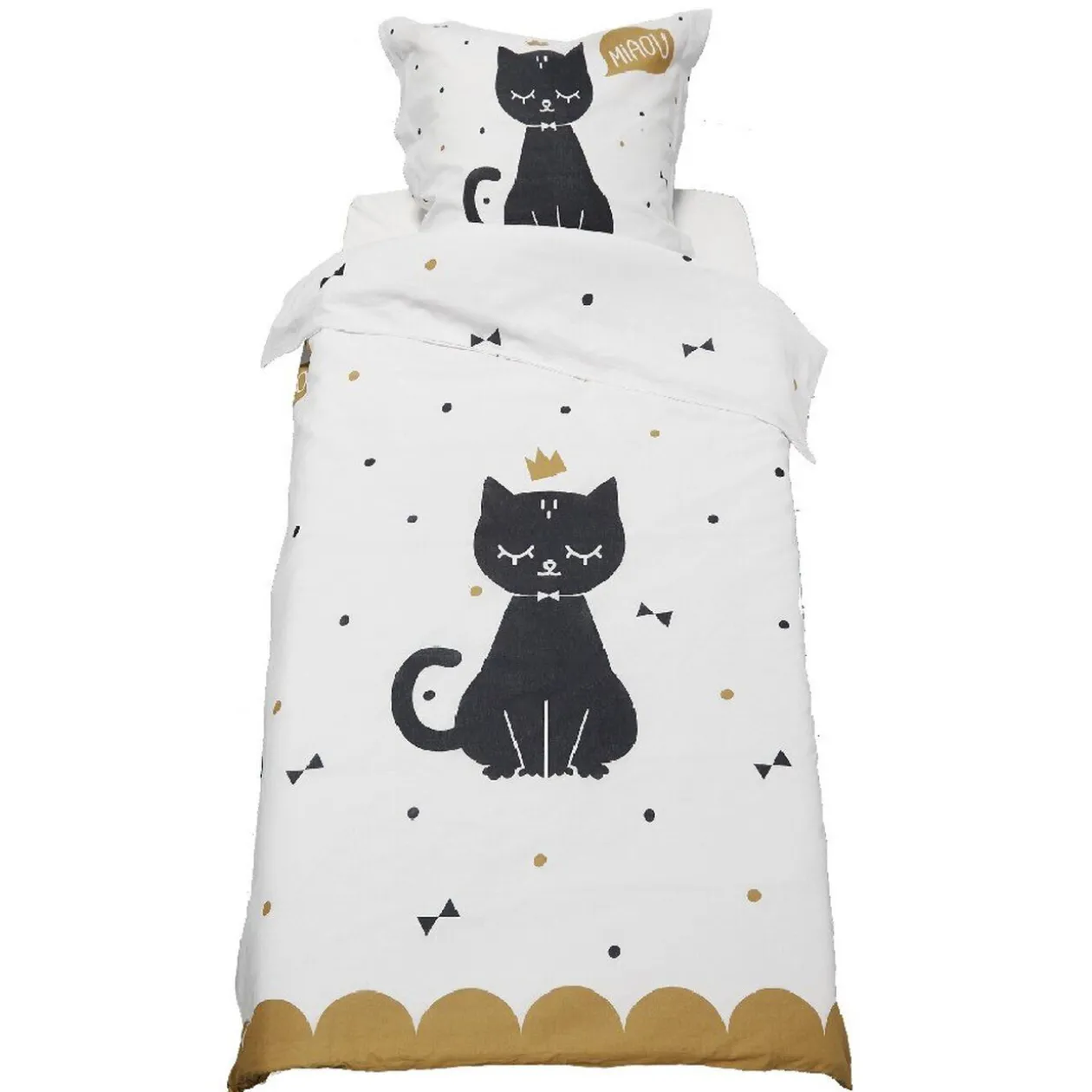Parure de lit 1 personne de couleur blanc, noir et doré, motif chat.