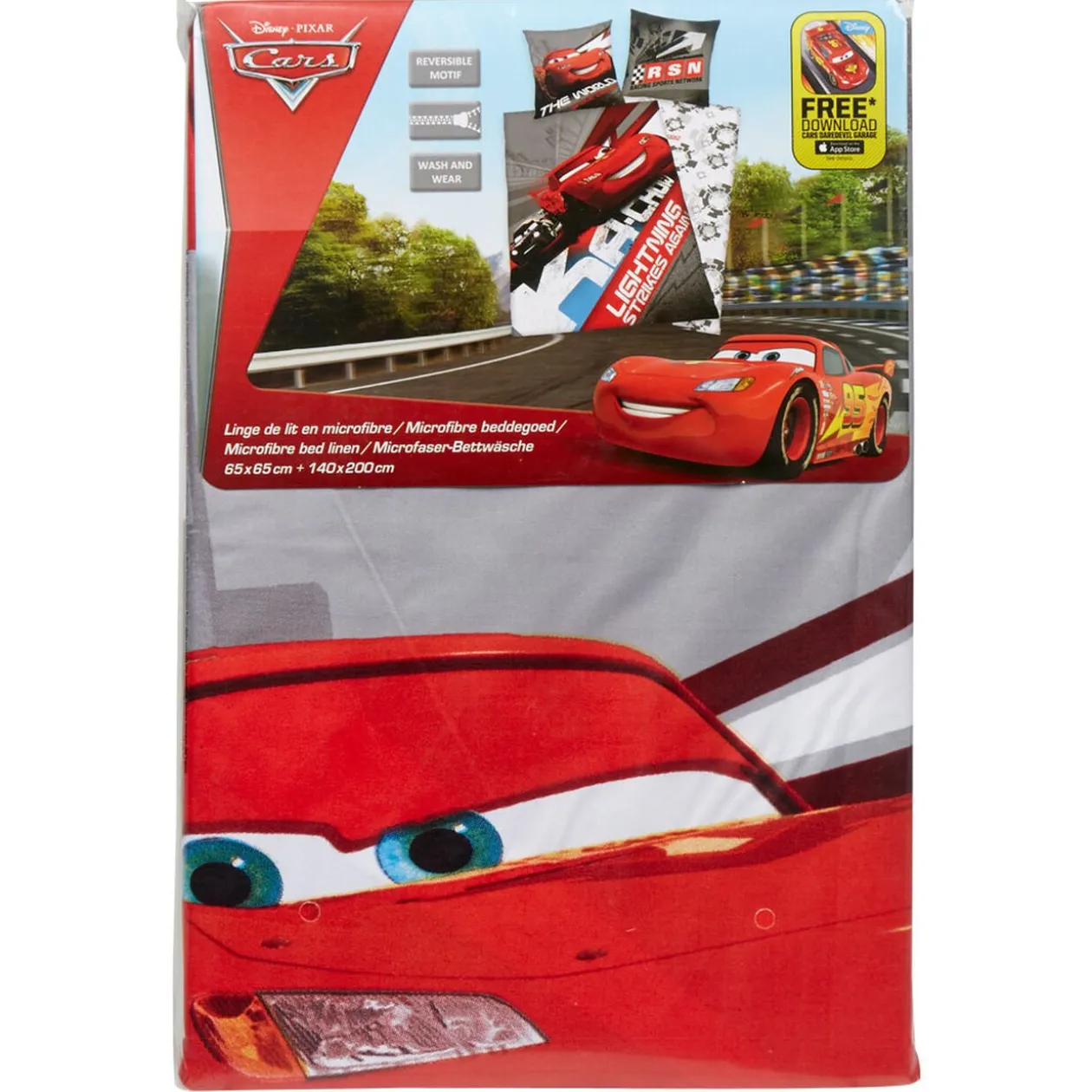 Parure de lit 1 place design Cars comprenant 1 housse de couette dim. 140×200 cm et 1 taie d’oreiller dim. 63×63 cm, 100% polyester microfibre.
