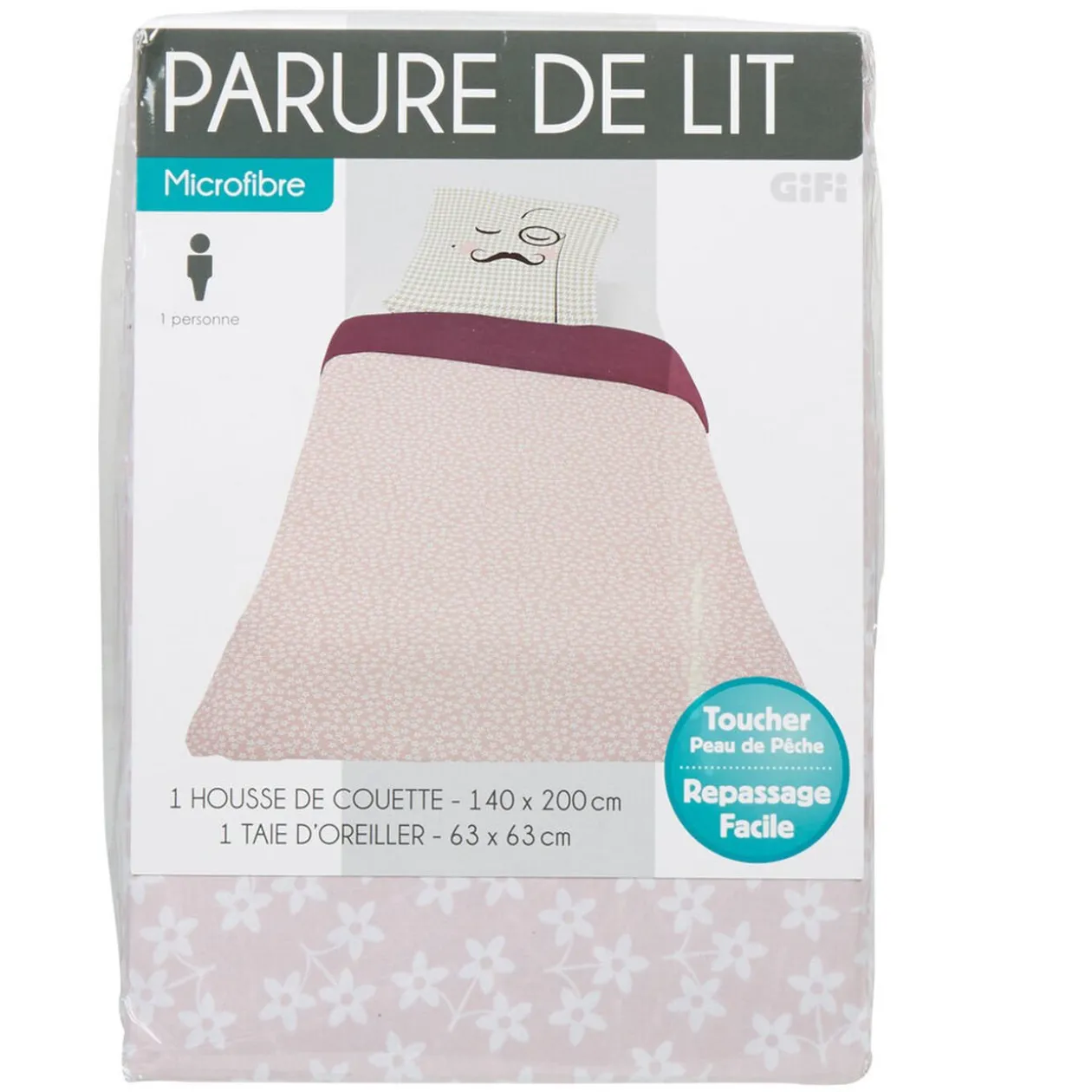 Parure de lit 1 place design moustache comprenant 1 housse de couette dim. 140×200 cm et 1 taie d’oreiller dim. 63×63 cm, 100% polyester microfibre.