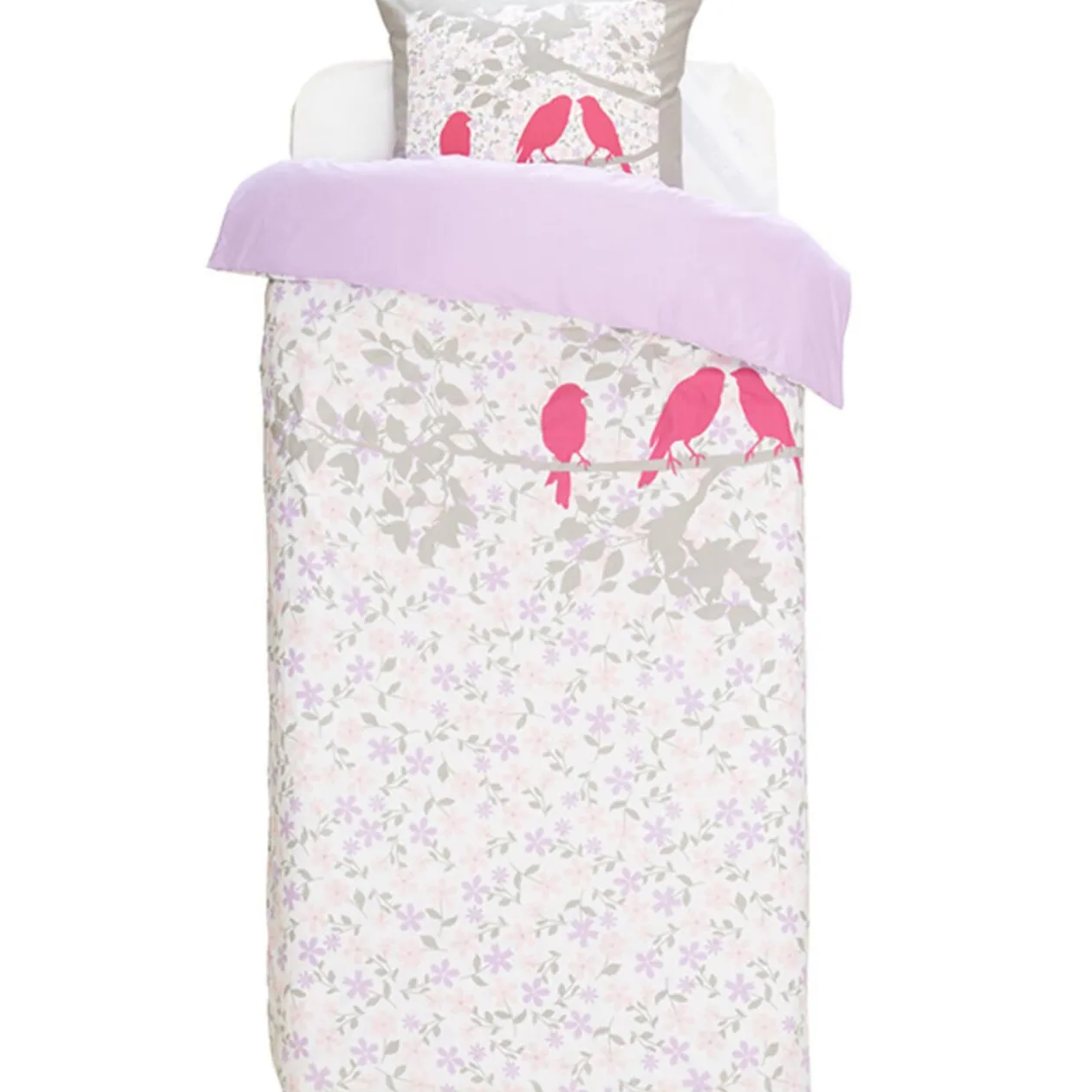 Parure de lit 1 place design oiseaux comprenant 1 housse de couette dim. 140×200 cm et 1 taie d’oreiller dim. 63×63 cm, 100 % polyester microfibre.