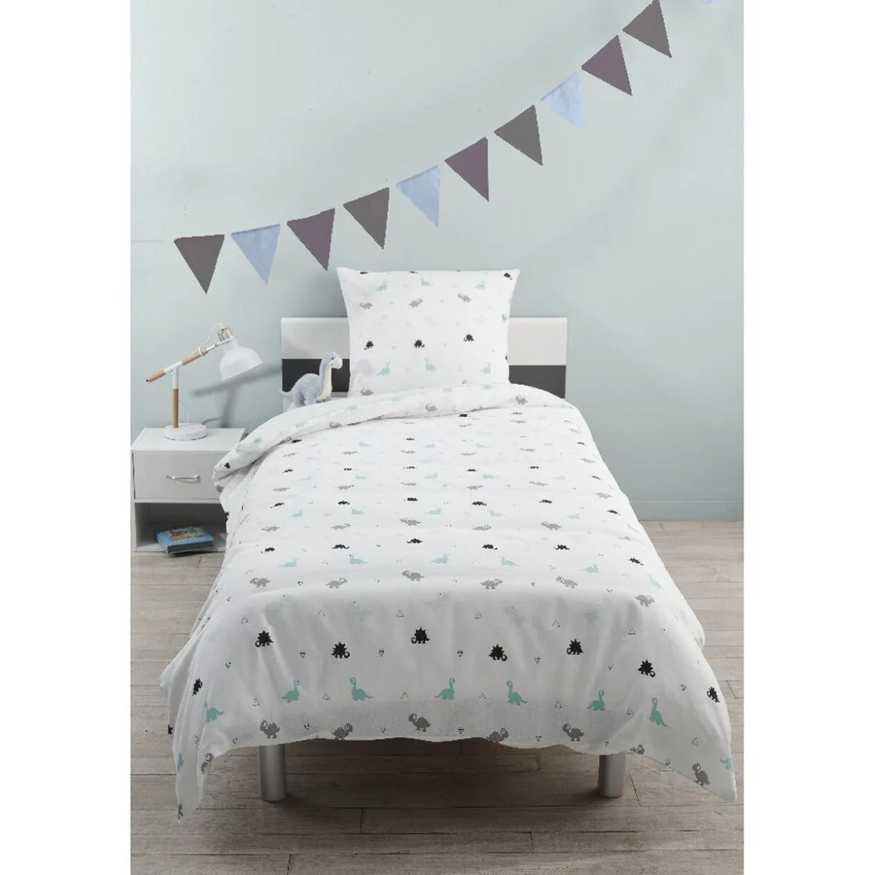 Fais des rêves remplis d’aventures avec les dinosaures de ton oreiller et de ta housse de couette. Le diplodocus, le tyrannosaure et le stégosaure te protégeront la nuit. Cette parure de lit sera parfaite pour la chambre d’un enfant courageux et fort comme toi ! .