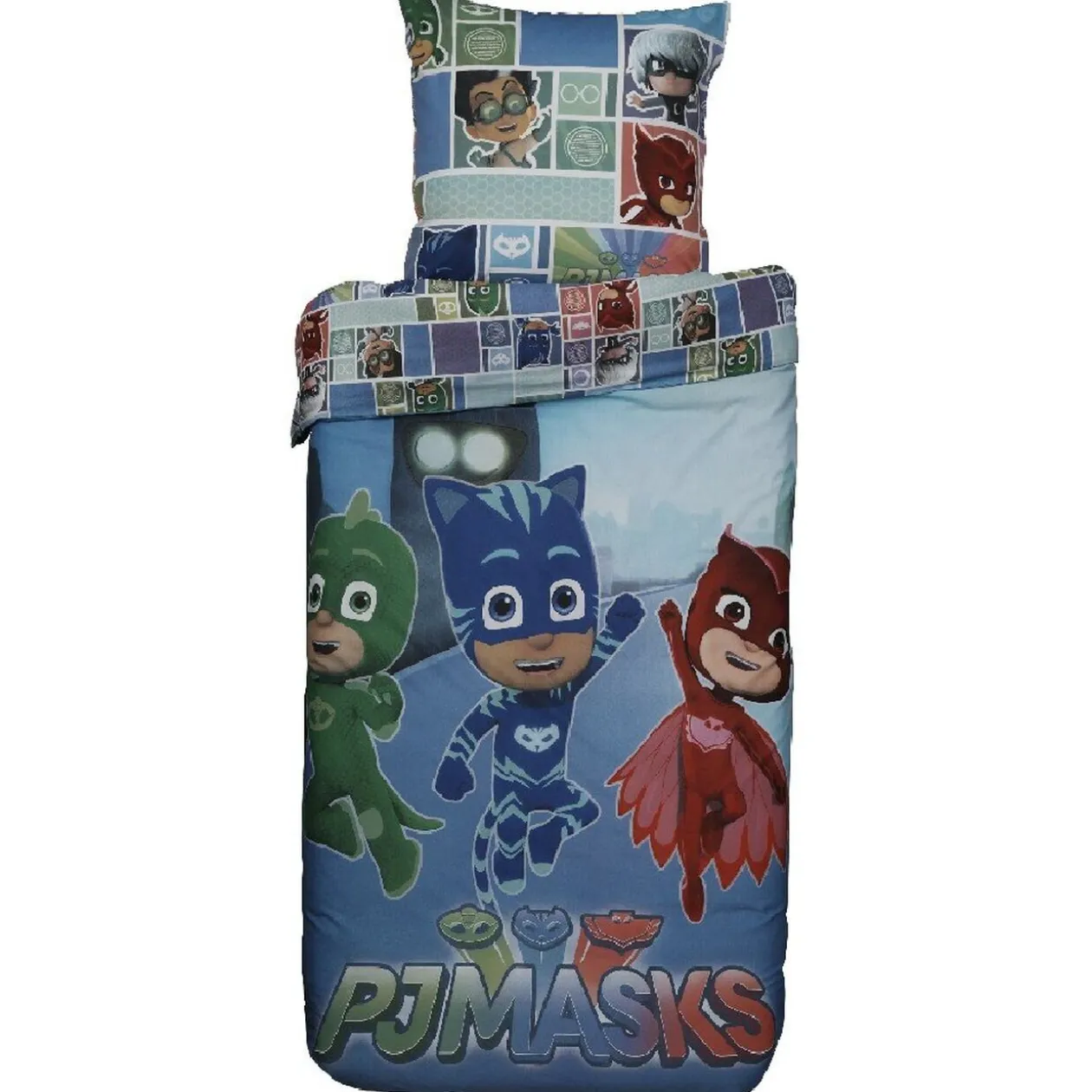Parure de lit 1 place à fond bleu représentant les 3 héros de la nuit du dessin animé Pyjamasque.