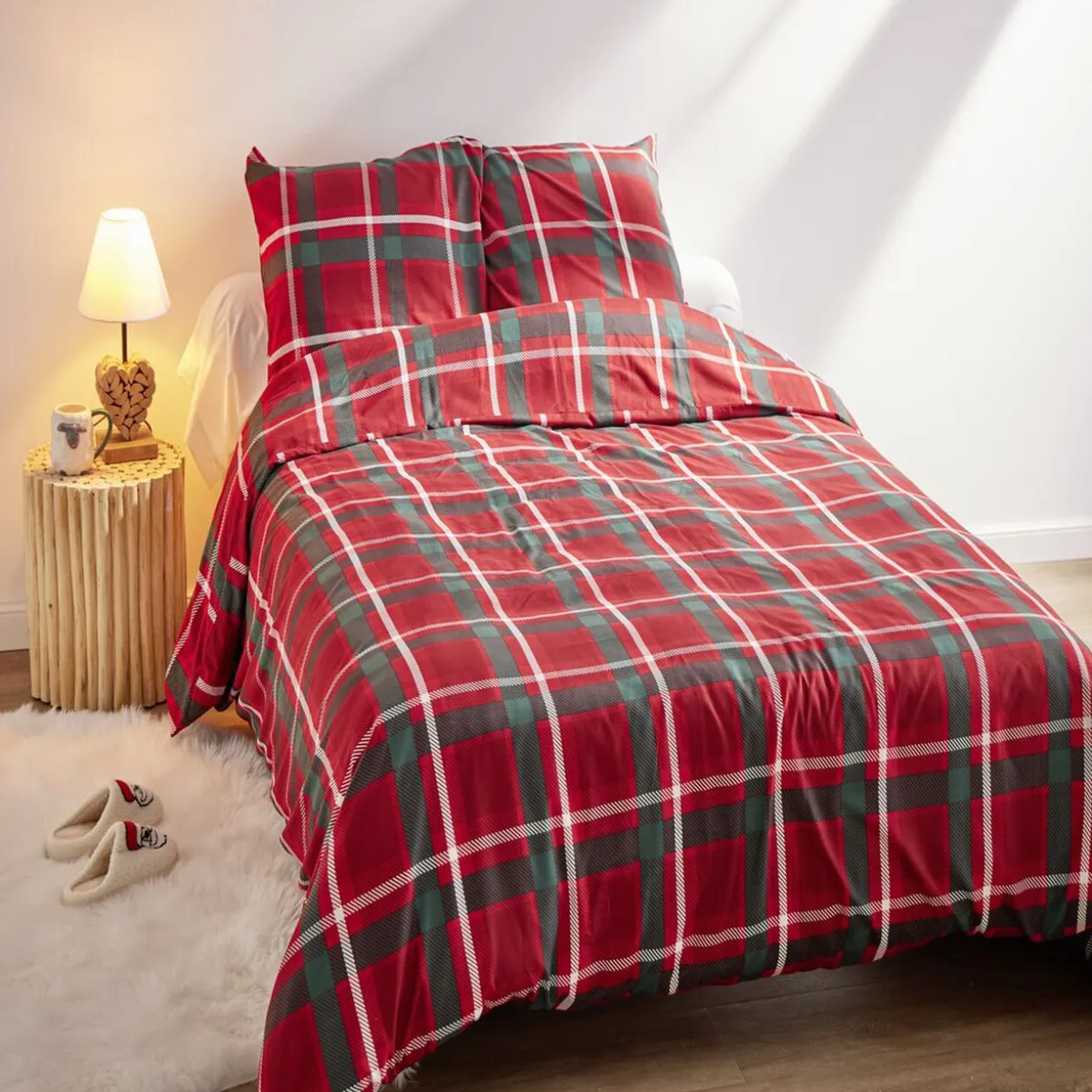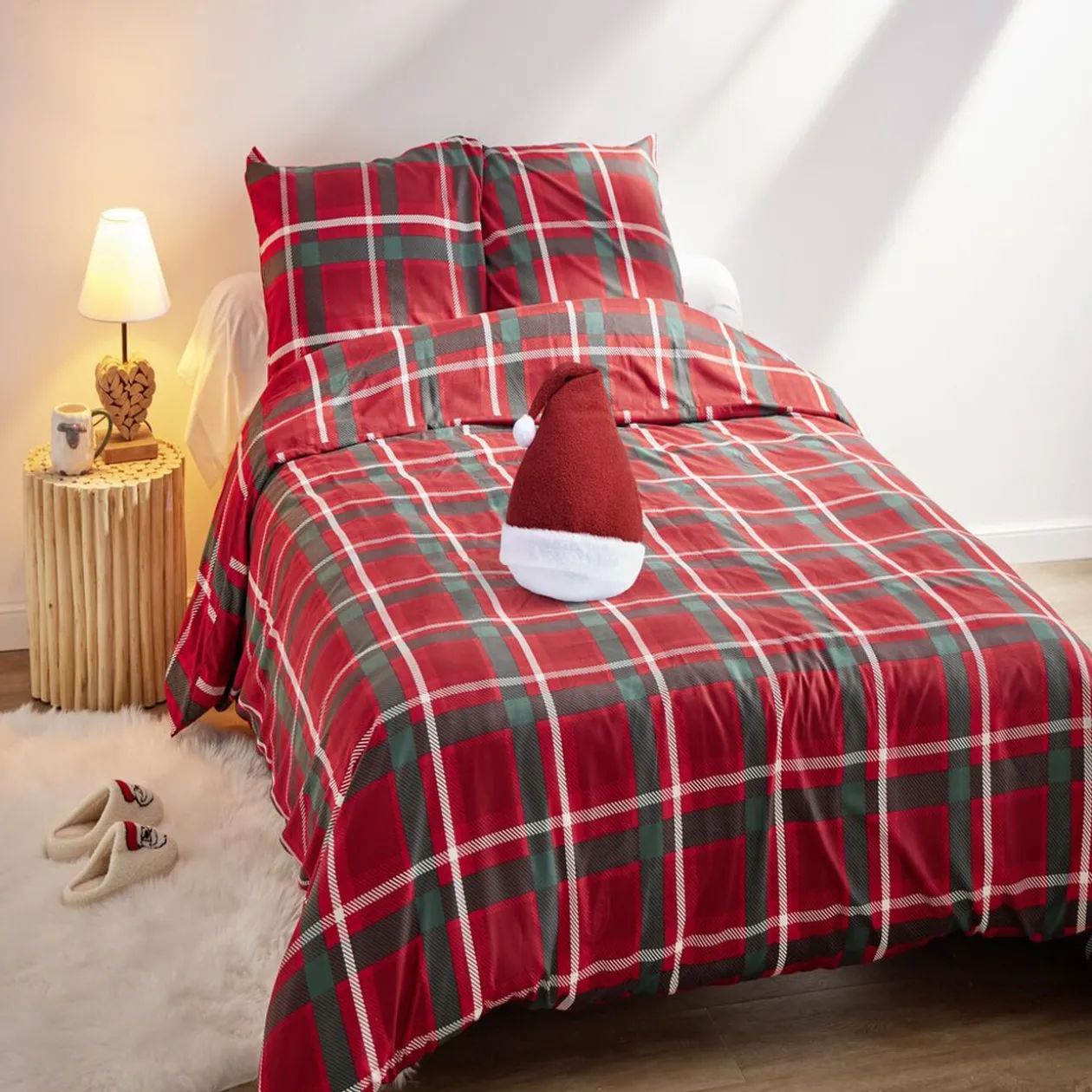 Apportez une touche chaleureuse à votre chambre avec cette parure de lit à motif tartan rouge et vert, un rappel de l’esprit de Noël.
