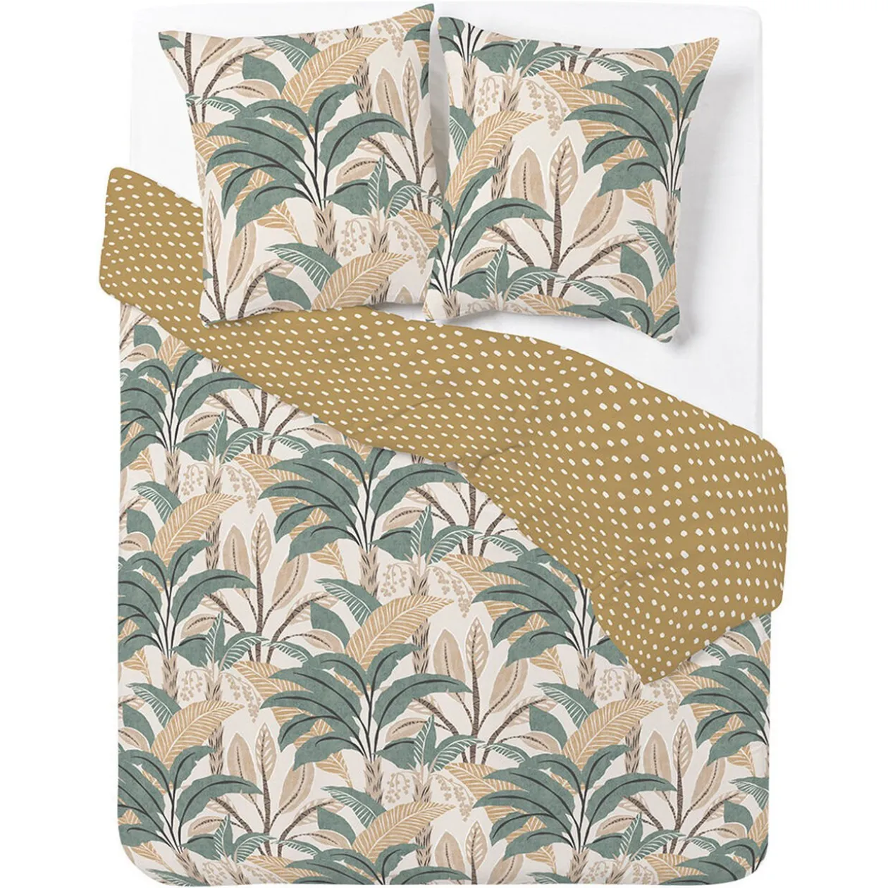 Réversible avec un côté à motifs feuillages exotiques et l’autre uni marron à pois blancs, cette parure de lit est idéale pour habiller joliment un lit en 140x190cm et agrémenter la décoration d’une chambre.