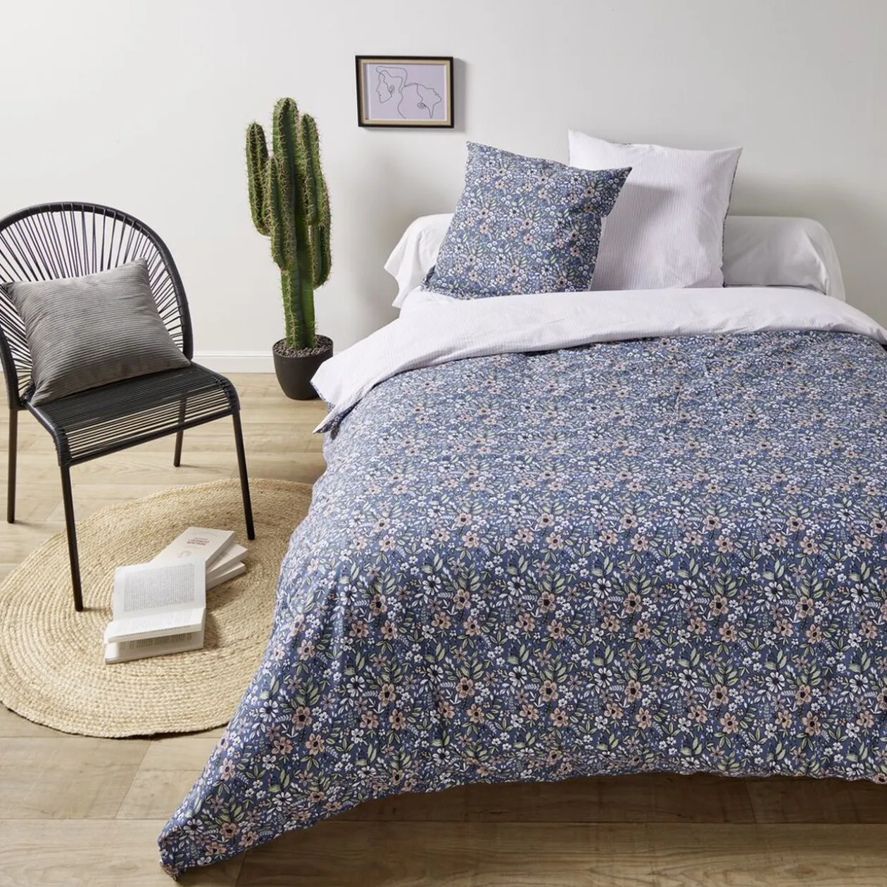 Cette parure à motifs floraux sur fond bleu-vert d’un côté et à rayures verticales beige sur fond blanc de l’autre viendra joliment habiller un lit en 140x190cm.